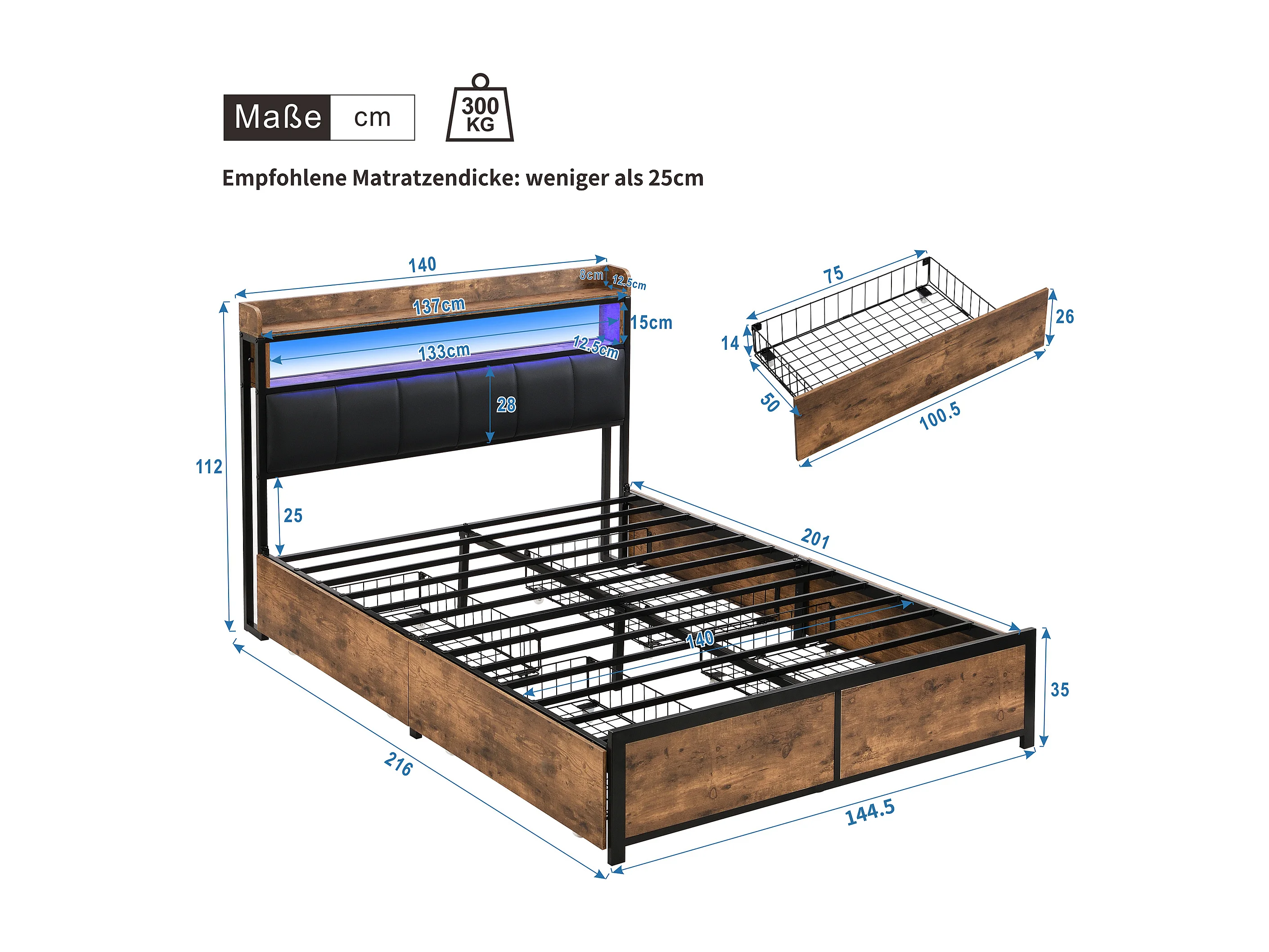 Letto imbottito 140x200 cm, letto LED, letto per adolescenti, con 4 cassetti, facile da montare, PU, nero