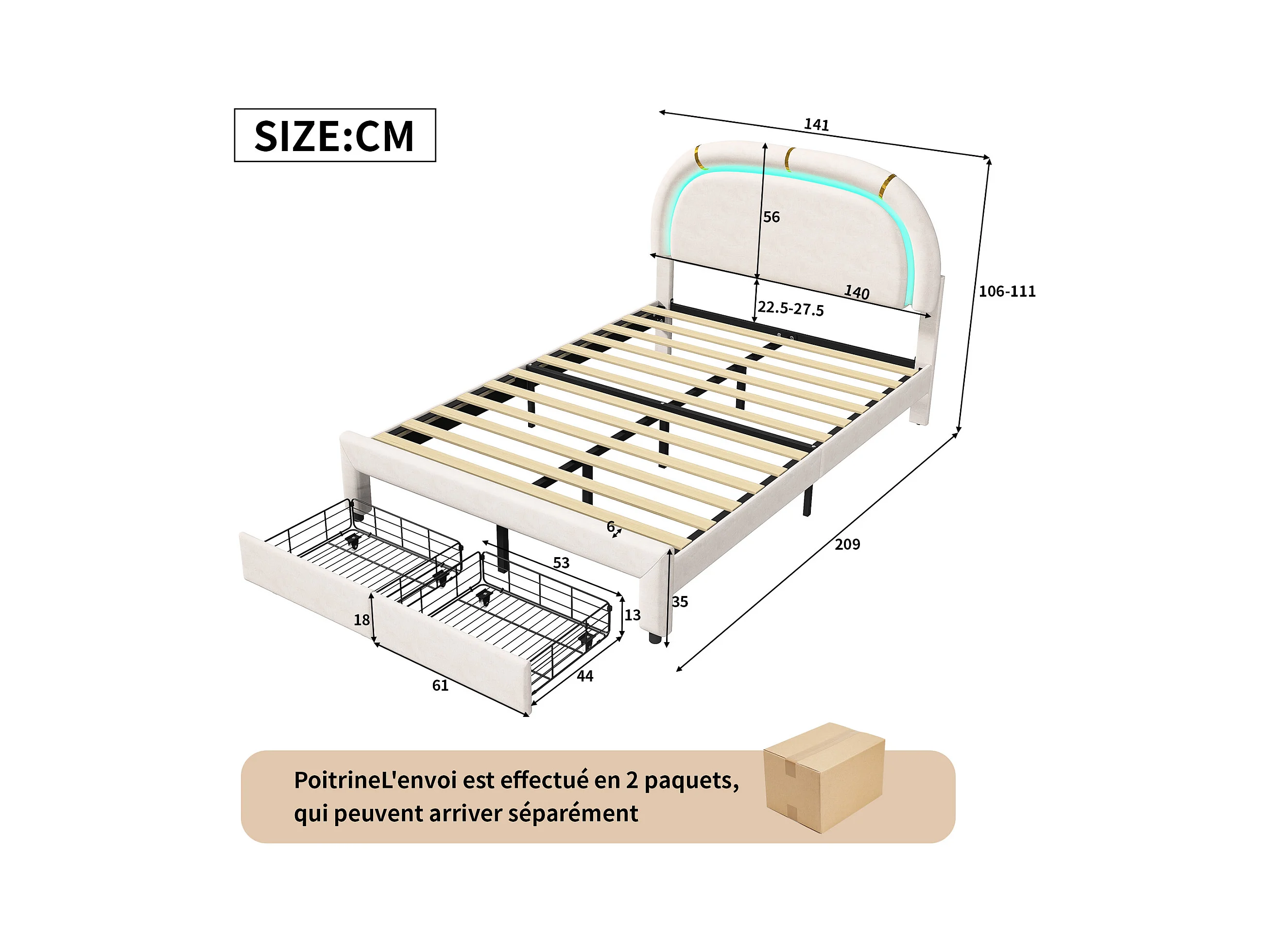 Letto imbottito 140x200, con LED e 2 cassetti, Struttura letto matrimoniale con testiera regolabile in altezza e doghe in legno (senza materasso) Beige