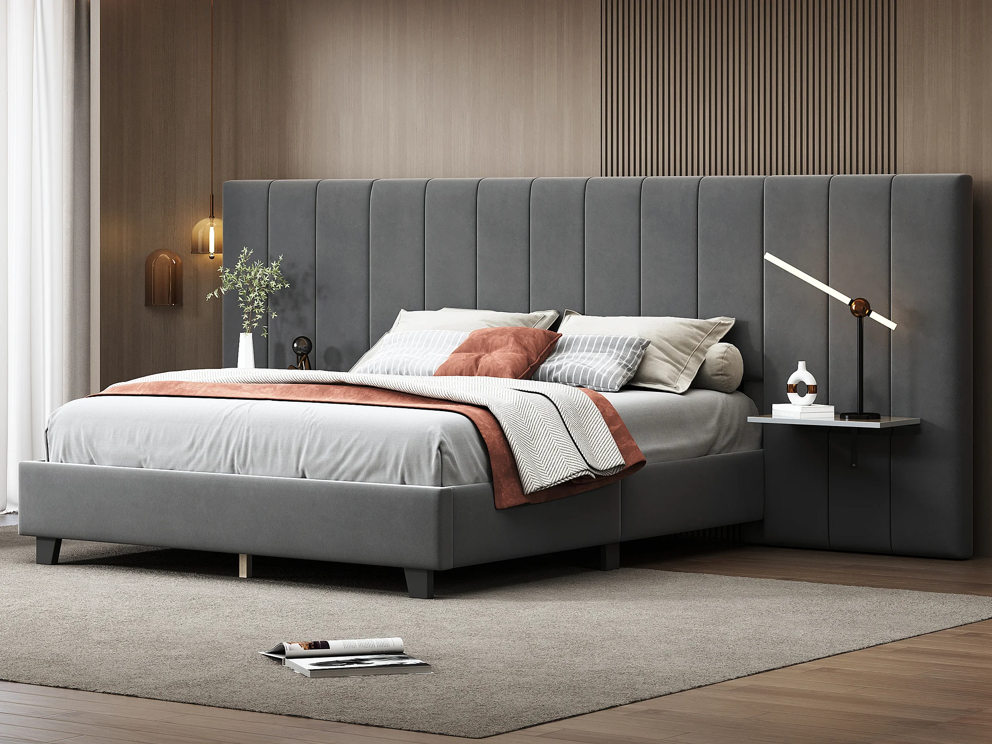 Letto imbottito 160 x 200 cm con testiera e schienale allungati - ripiani - velluto - grigio