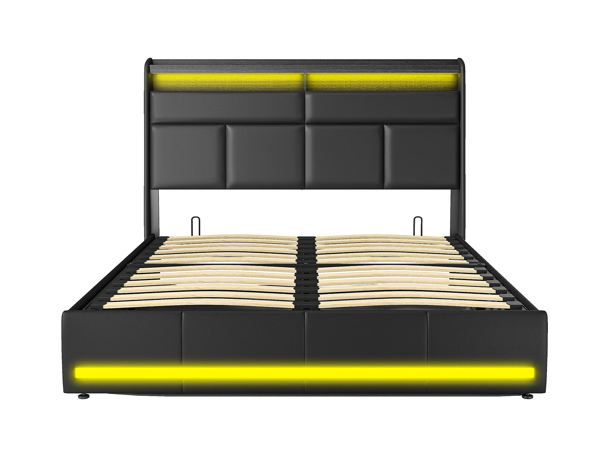 Letto imbottito 160x200 cm con luci LED, capitonné, rete a doghe, box letto e funzione idraulica, in PU nero, letto per ospiti per adulti.