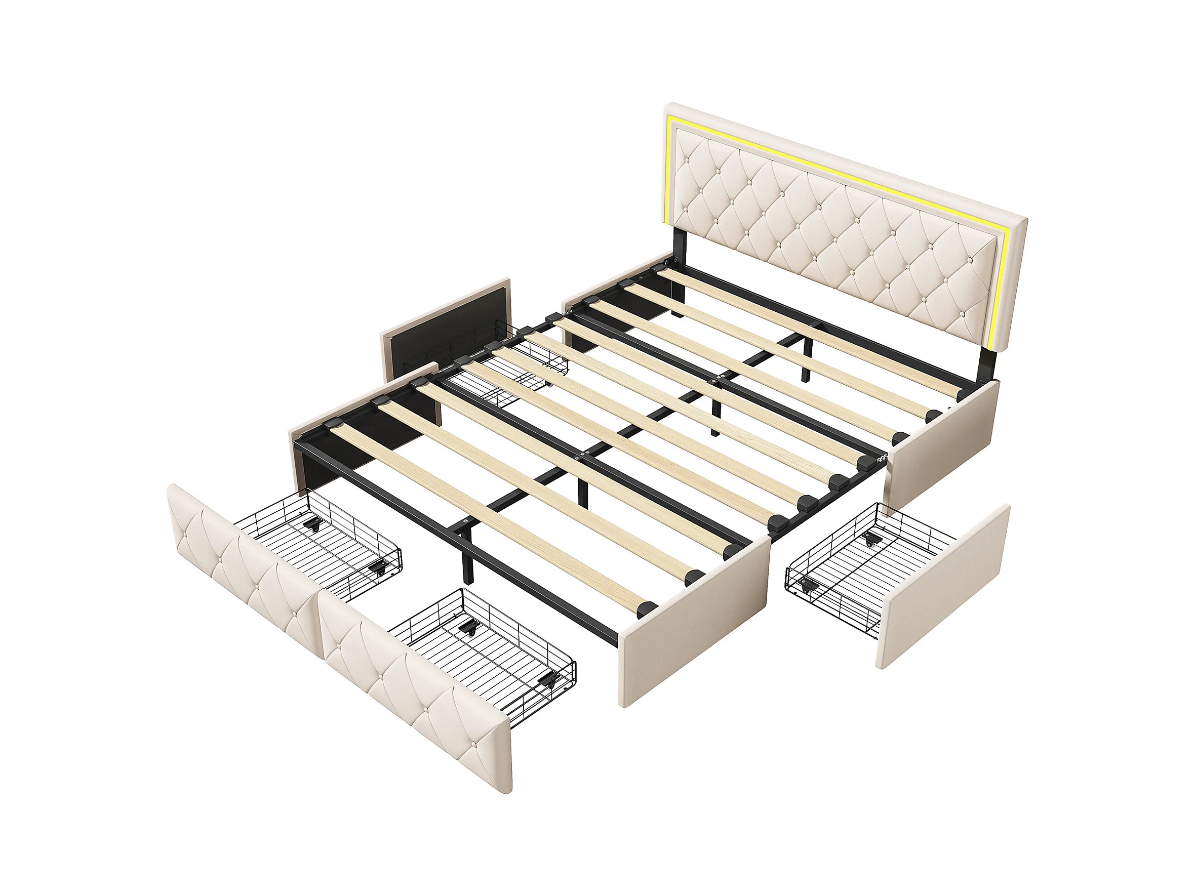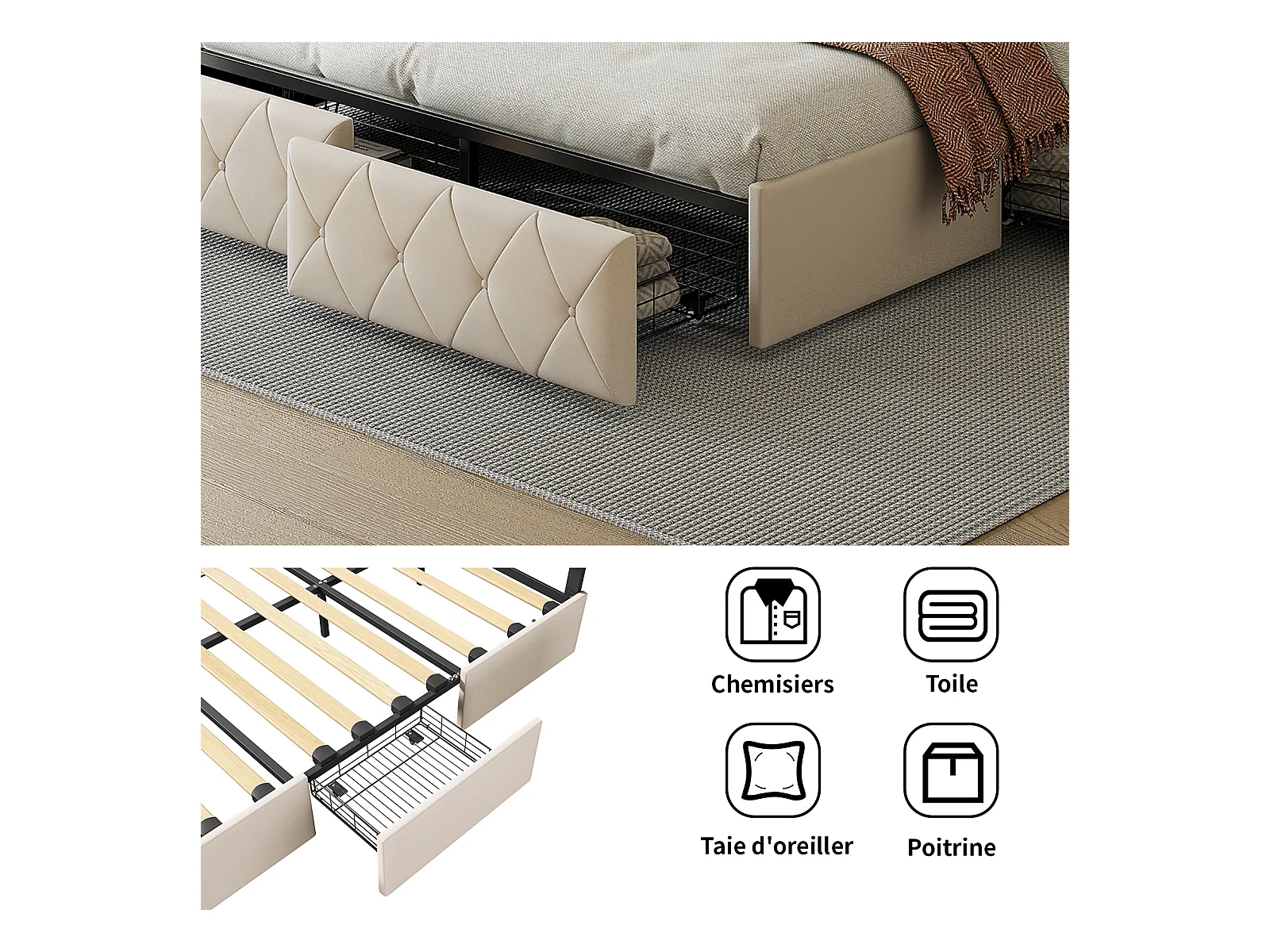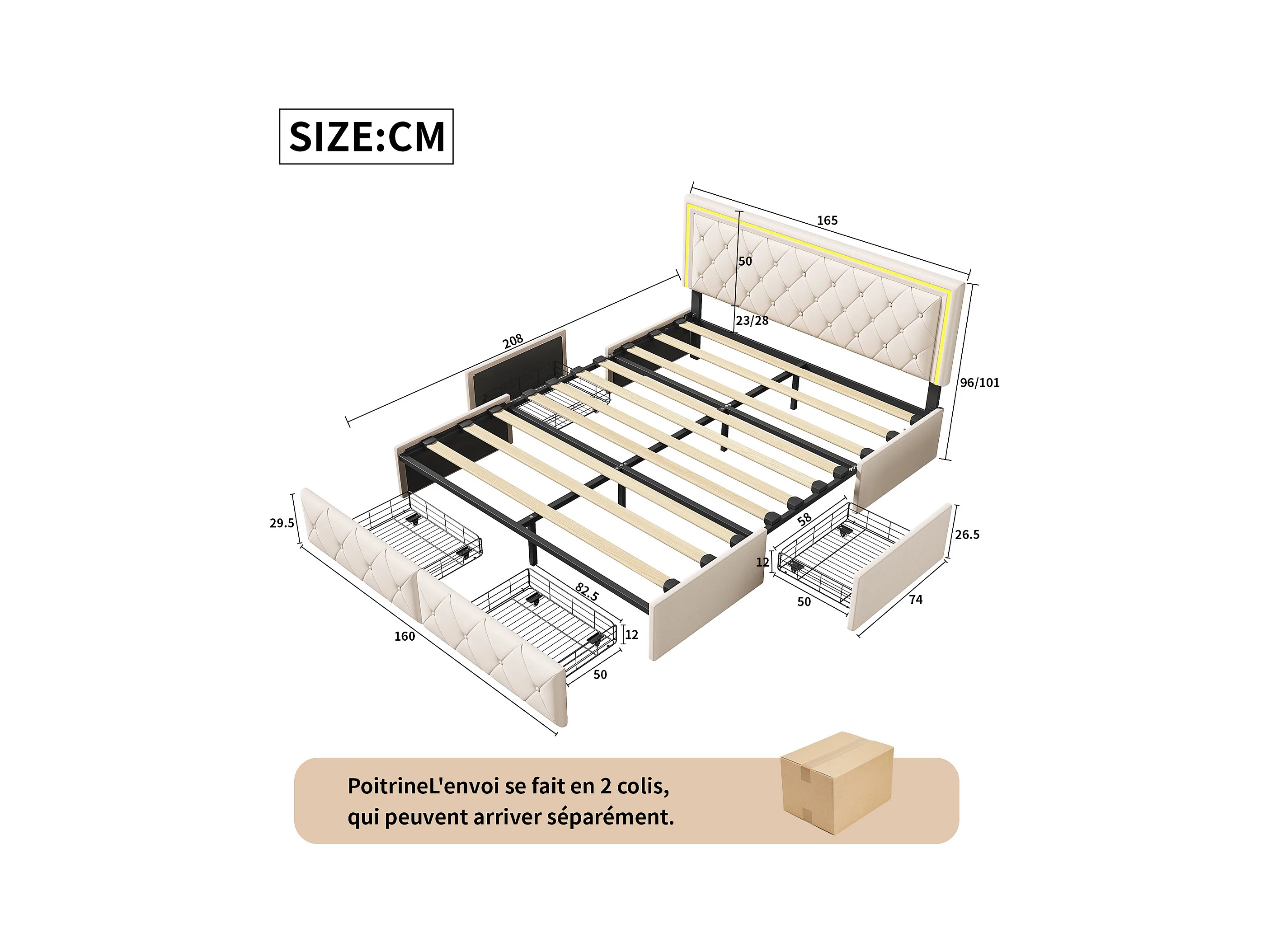 Letto imbottito a LED 160 x 200 cm, con 2 cassetti e rete a doghe, testiera regolabile, PU, beige