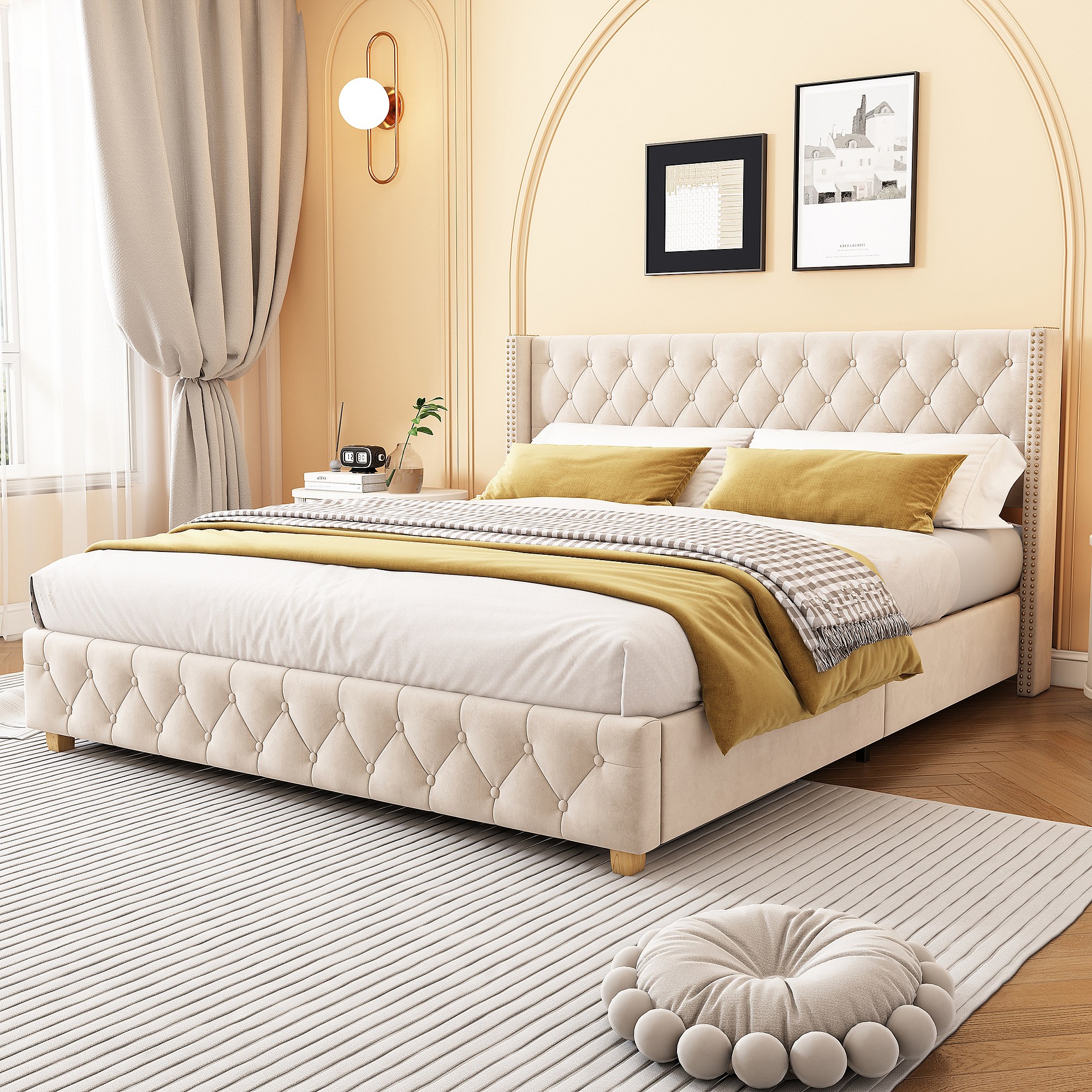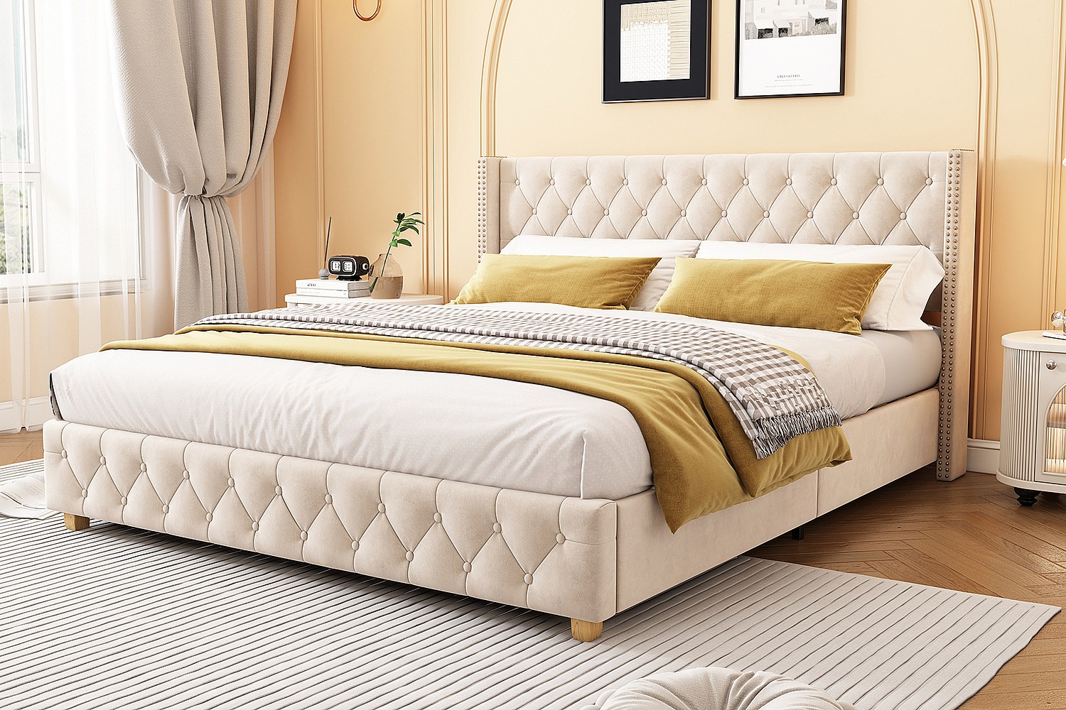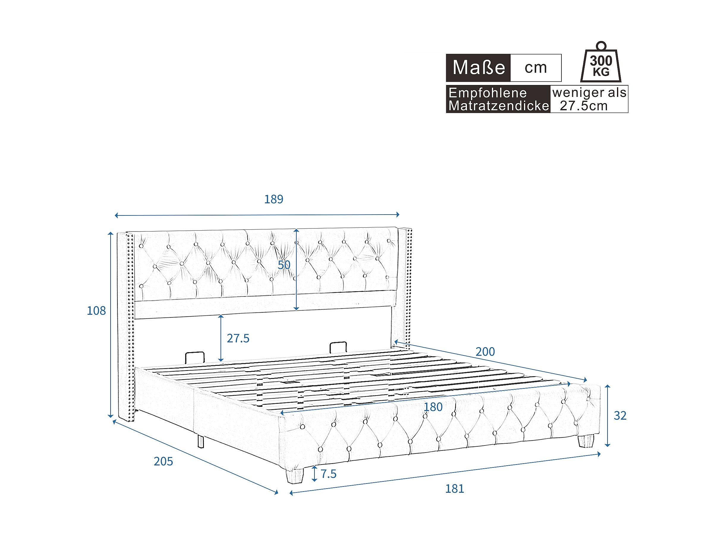 Letto imbottito 180x200 cm con testiera, bottoni, chiodi, gambe in legno, in velluto, beige chiaro (189x205x108 cm)