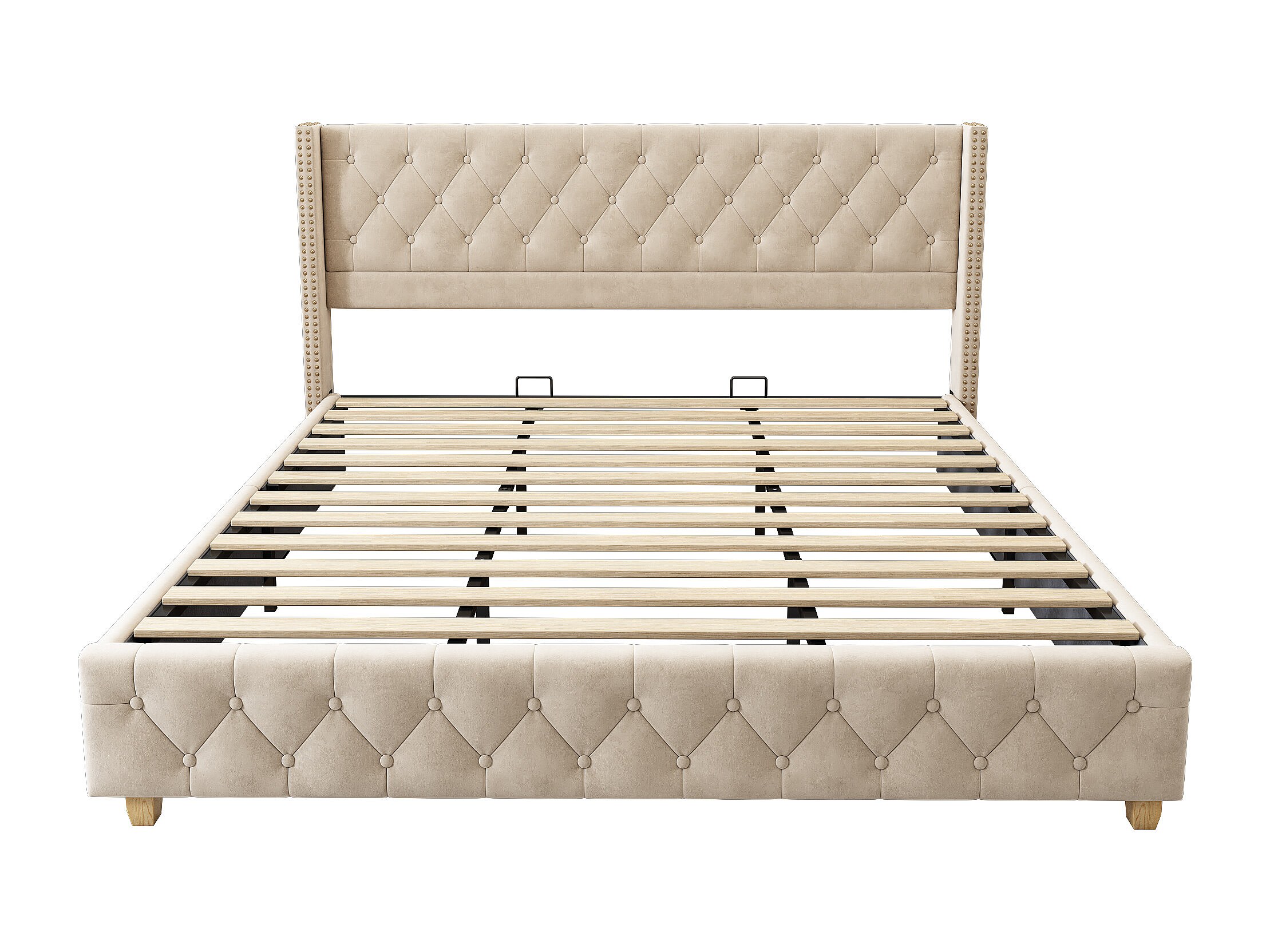 Letto con contenitore, testiera imbottita, velluto, beige, 180x200 cm, idraulico, con vano contenitore