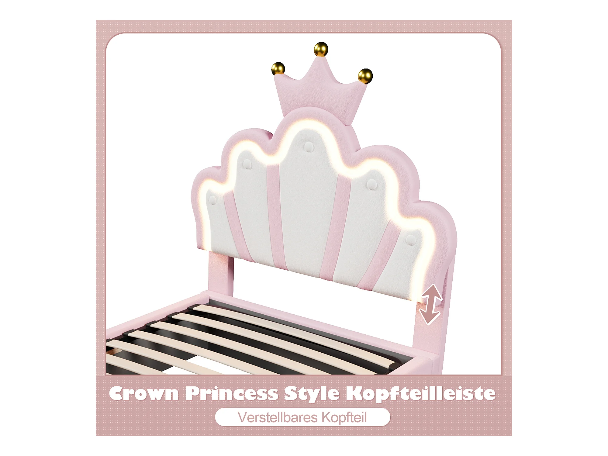 Letto imbottito, 90 x 200 cm, con striscia LED, meccanismo idraulico, testiera regolabile, design a corona, PU, rosa (204,5x91,5x133 cm)