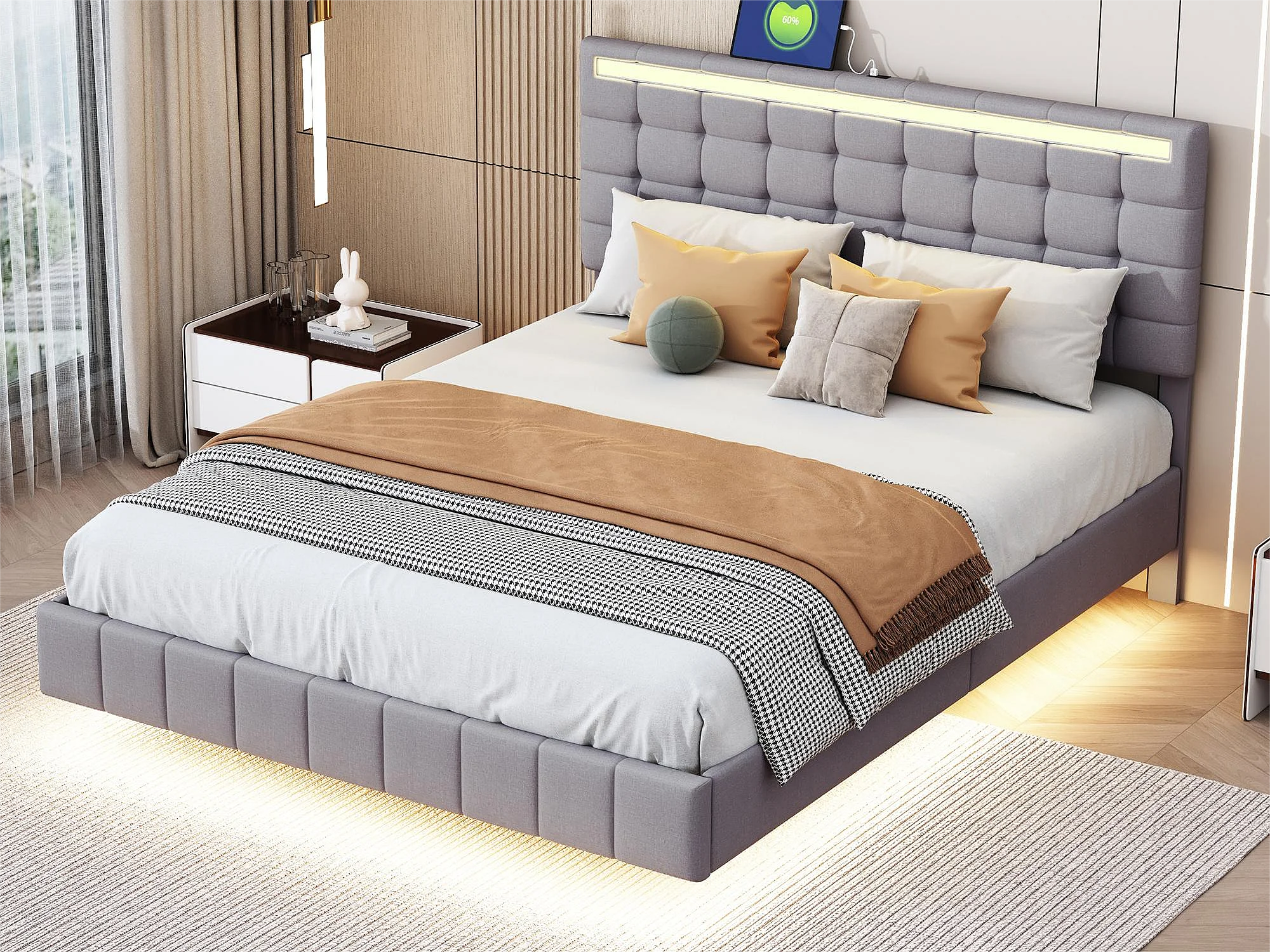 Letto imbottito con testiera - 140 x 200 cm - giroletto sospeso - LED - tessuto di lino - grigio