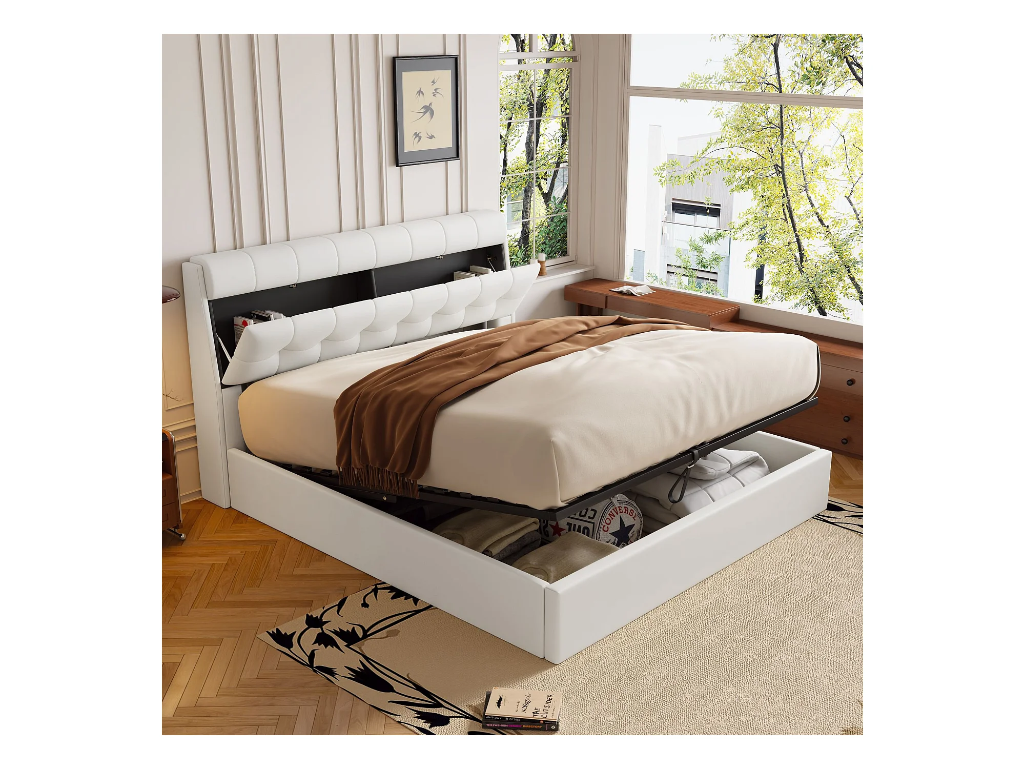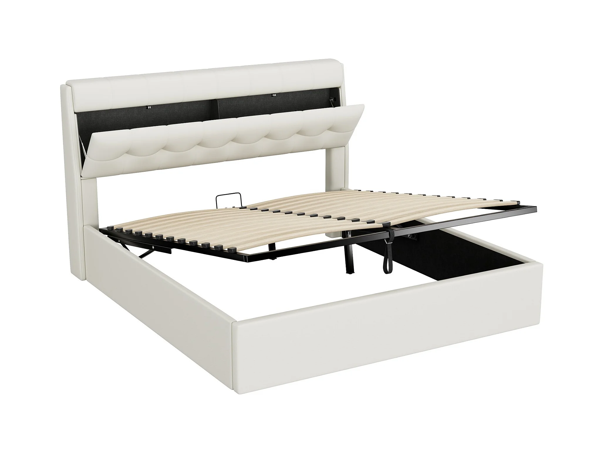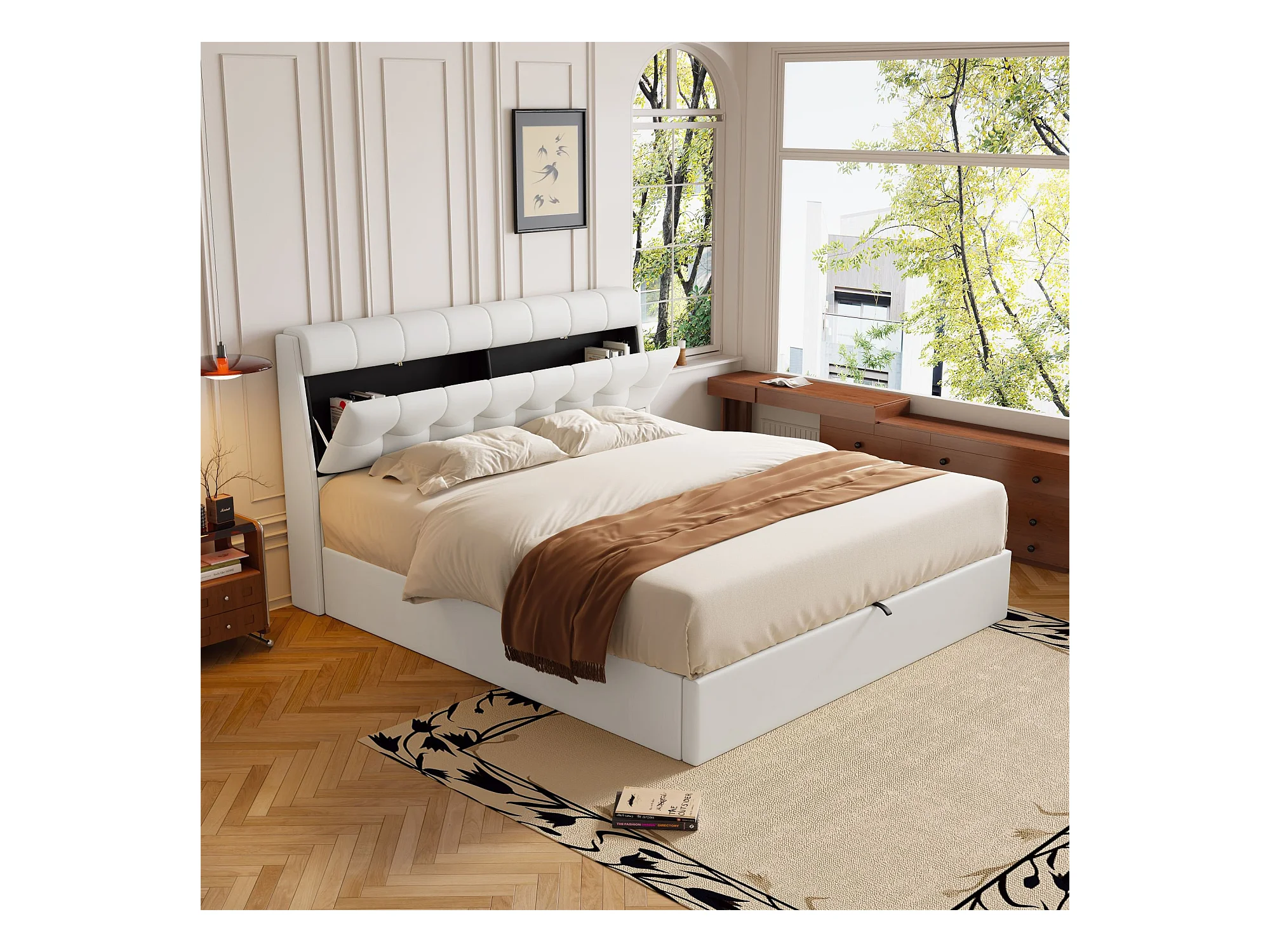Letto imbottito idraulico 160*200, contenitore a scomparsa sulla testata, contenitore sotto il letto, PU, con rete a doghe e testata, bianco