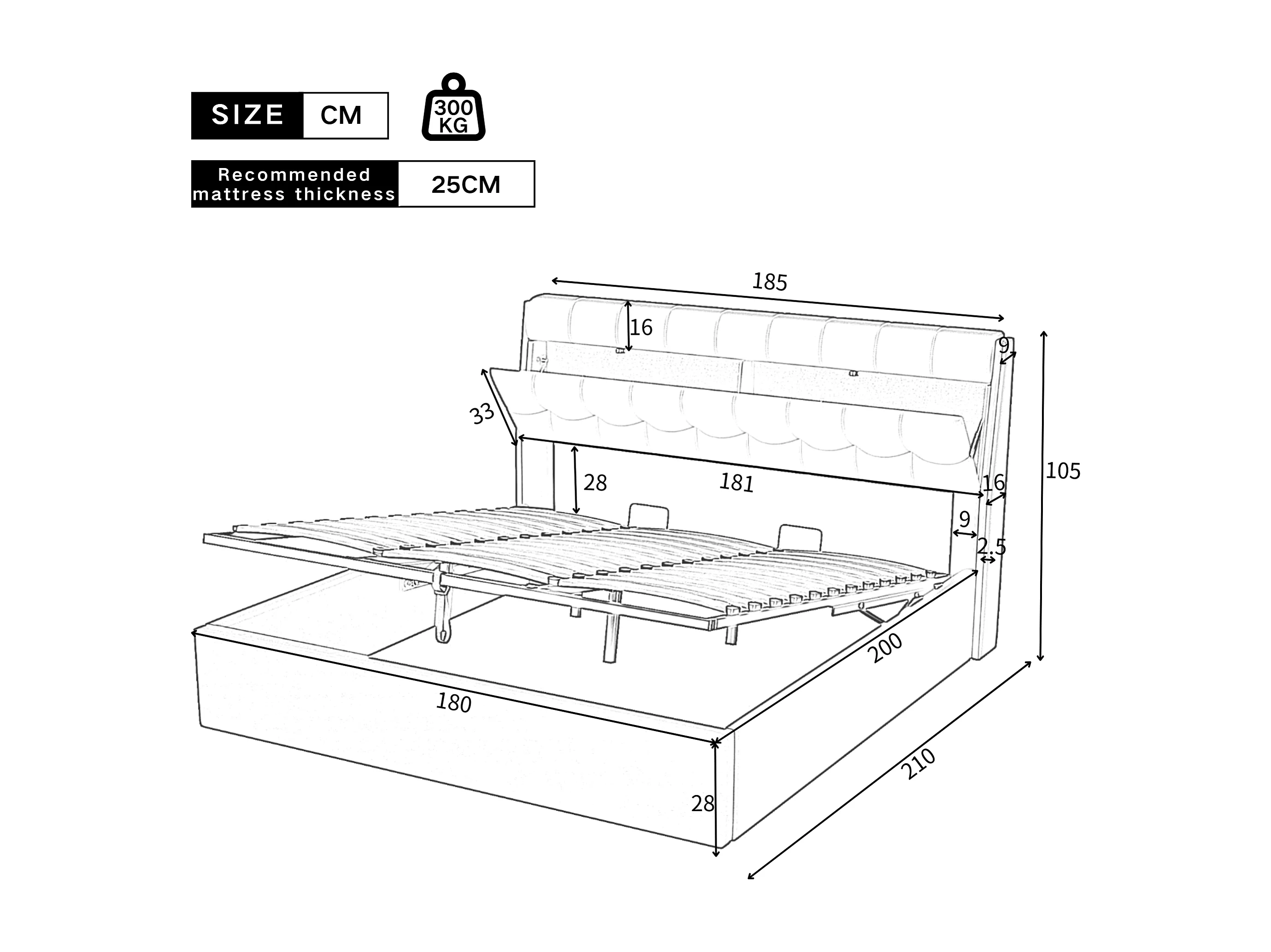 Letto imbottito idraulico 180*200, contenitore a scomparsa sulla testata, contenitore sotto il letto, PU, con rete a doghe e testata, bianco