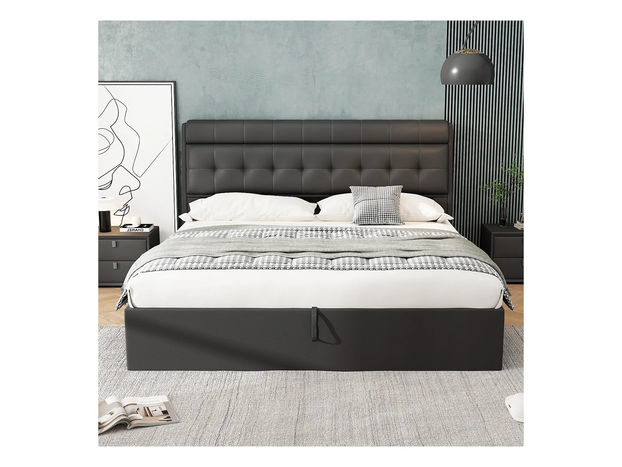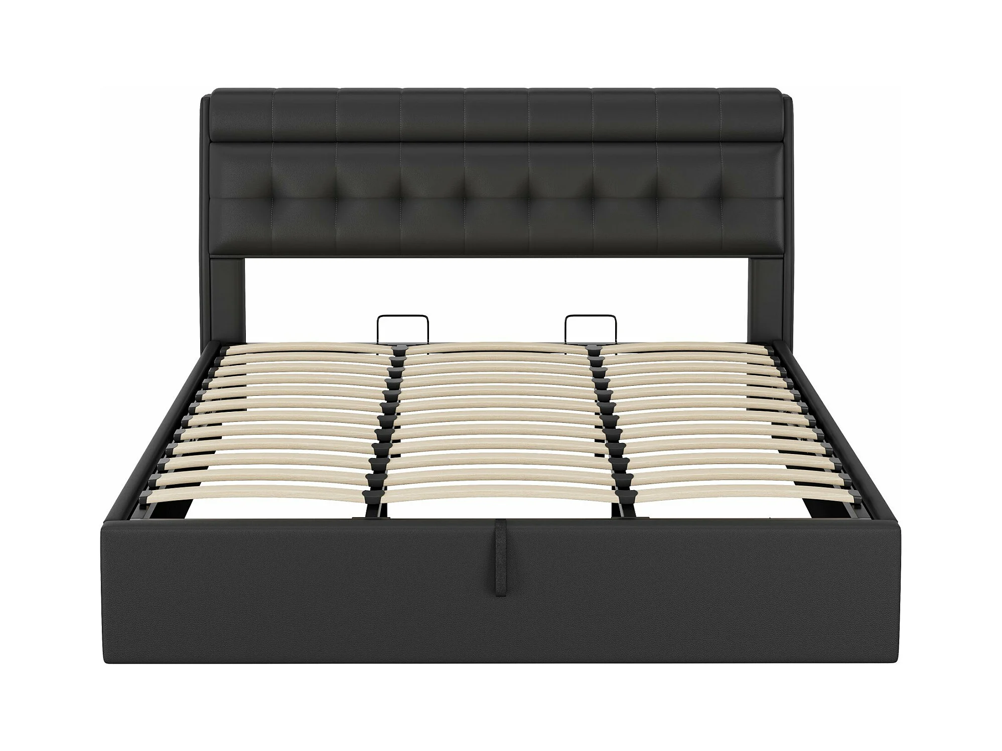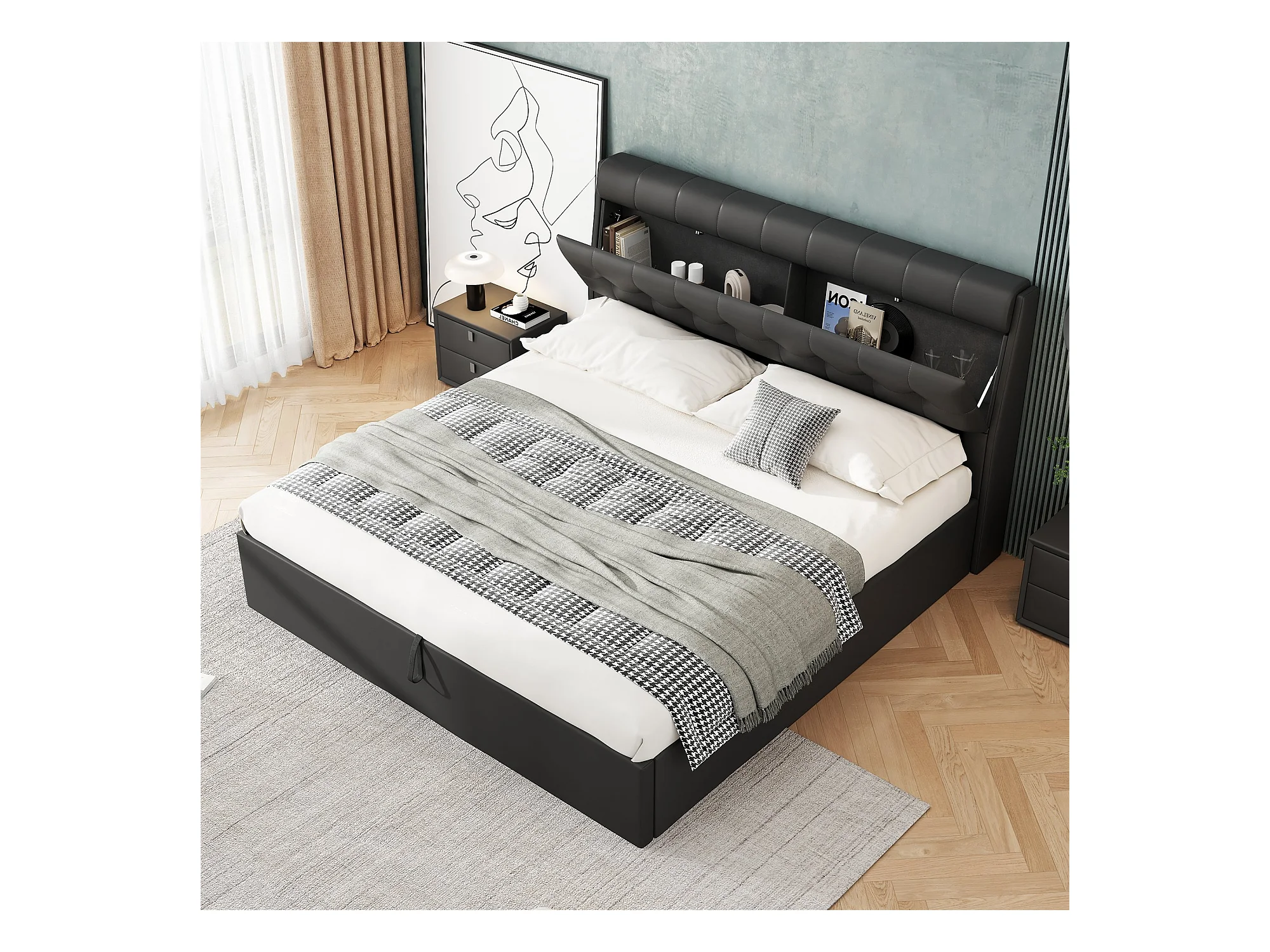 Letto imbottito idraulico 180*200, contenitore a scomparsa sulla testata, contenitore sotto il letto, PU, con rete a doghe e testata, nero