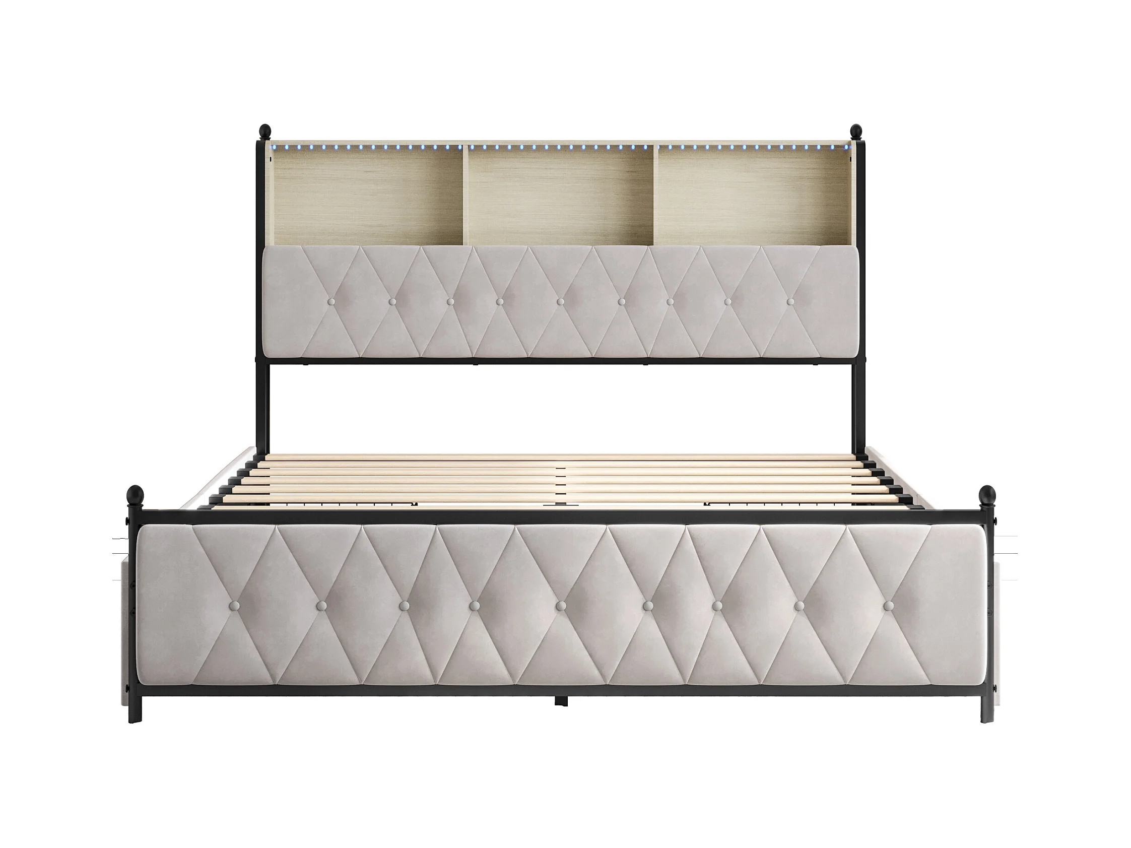 Letto imbottito per adulti con LED e USB, 4 cassetti, rete a doghe, velluto, 180x200cm, Beige