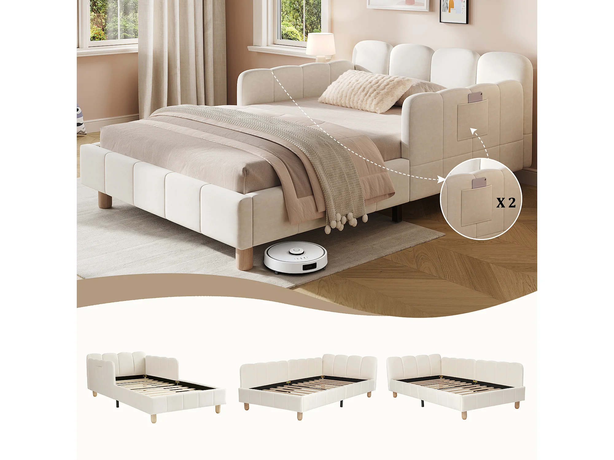 Letto imbottito per bambini - 90 x 200 cm - con testiera e sponda di sicurezza - gambe in legno massello - velluto - beige