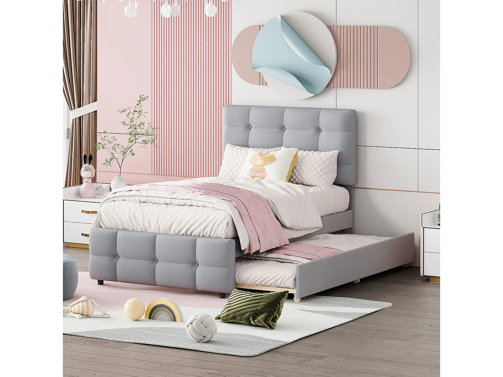 Letto imbottito per bambini 90x200 cm grigio, letto estraibile con testiera regolabile, rivestimento in morbido lino, letto singolo multifunzionale