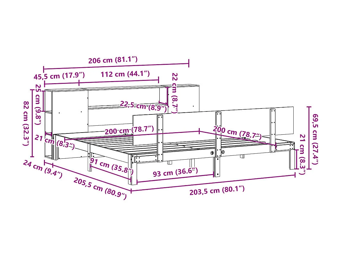 Letto Libreria senza Materasso 200x200 cm in Legno di Pino