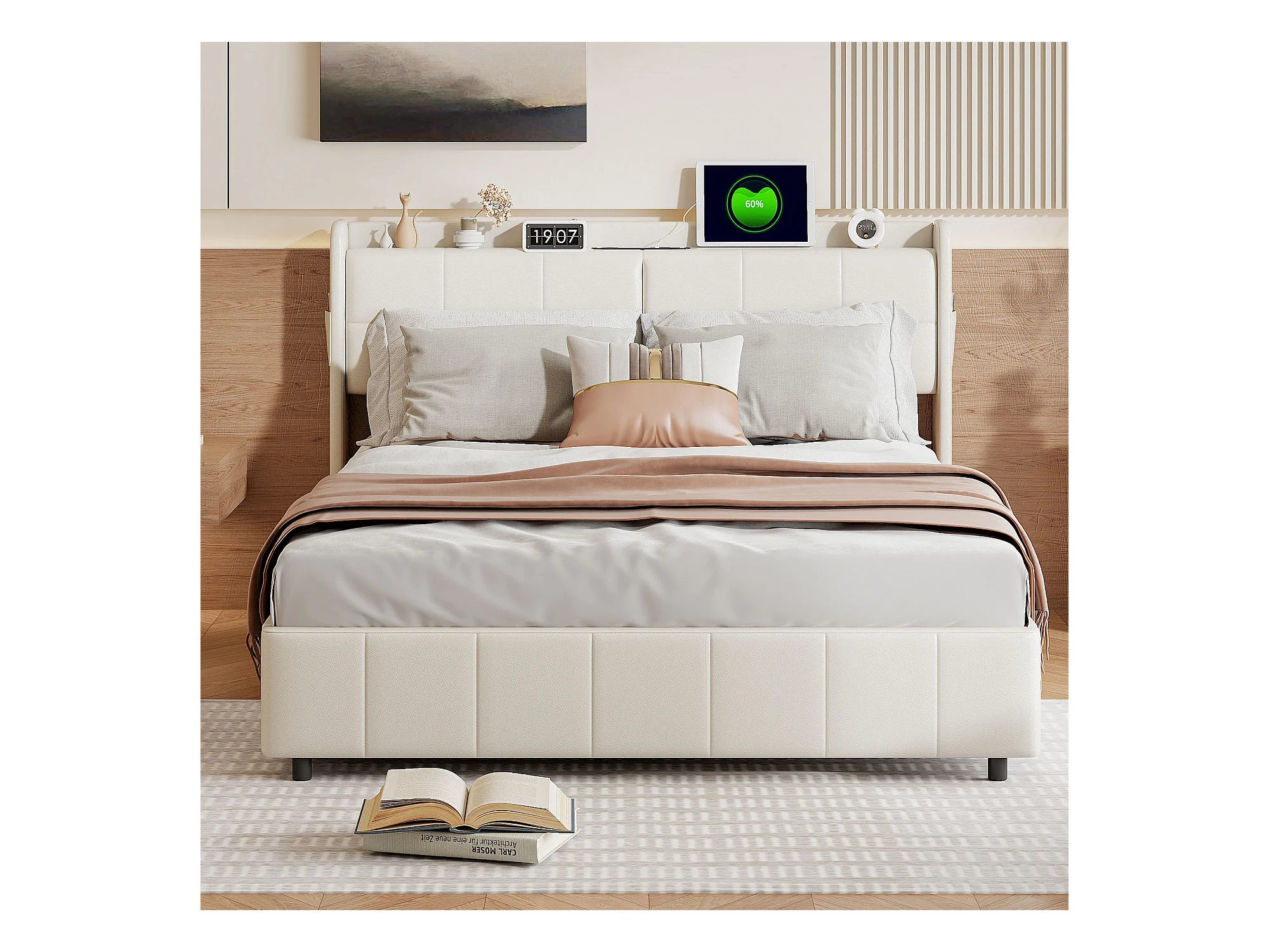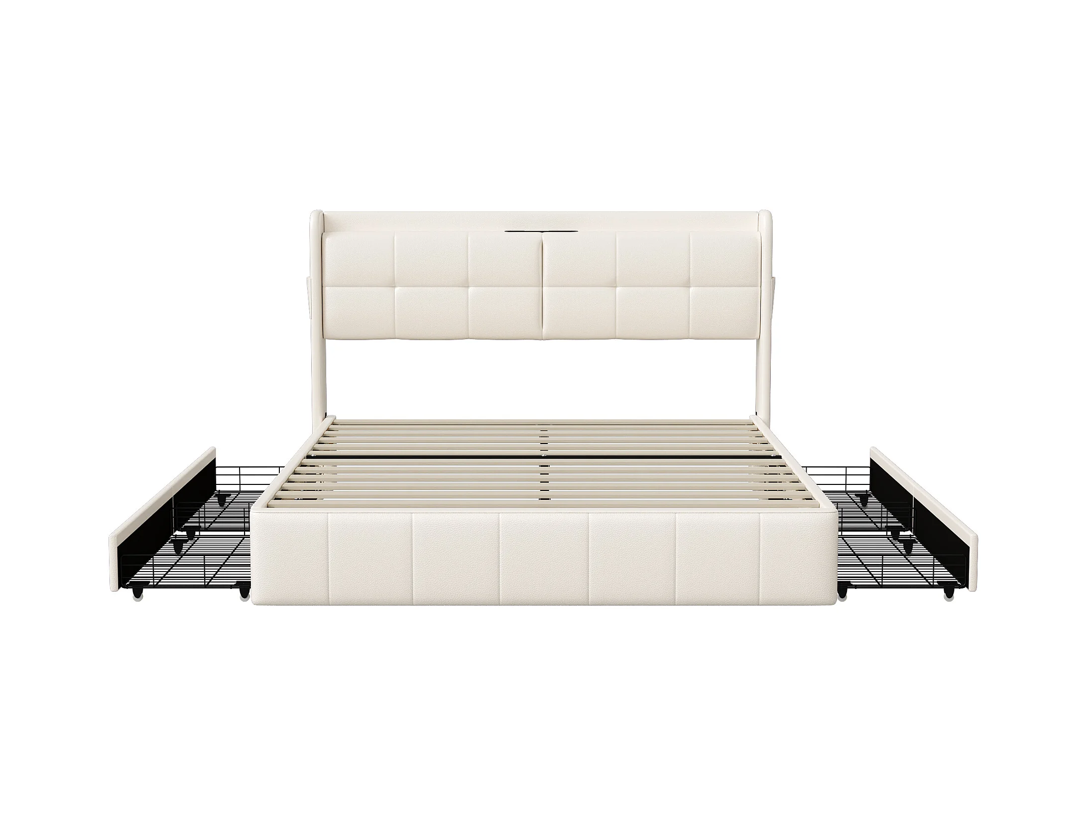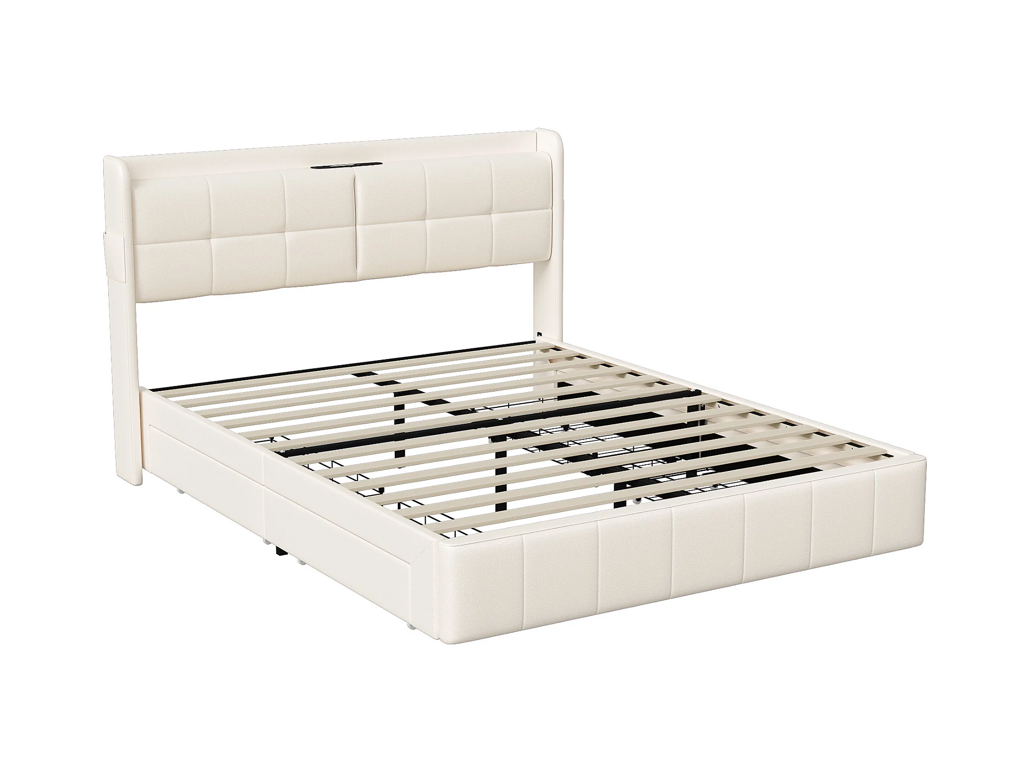 Letto matrimoniale 140 x 200 con 4 cassetti, Letto imbottito 140 x 200 con ricarica USB, PU, Beige