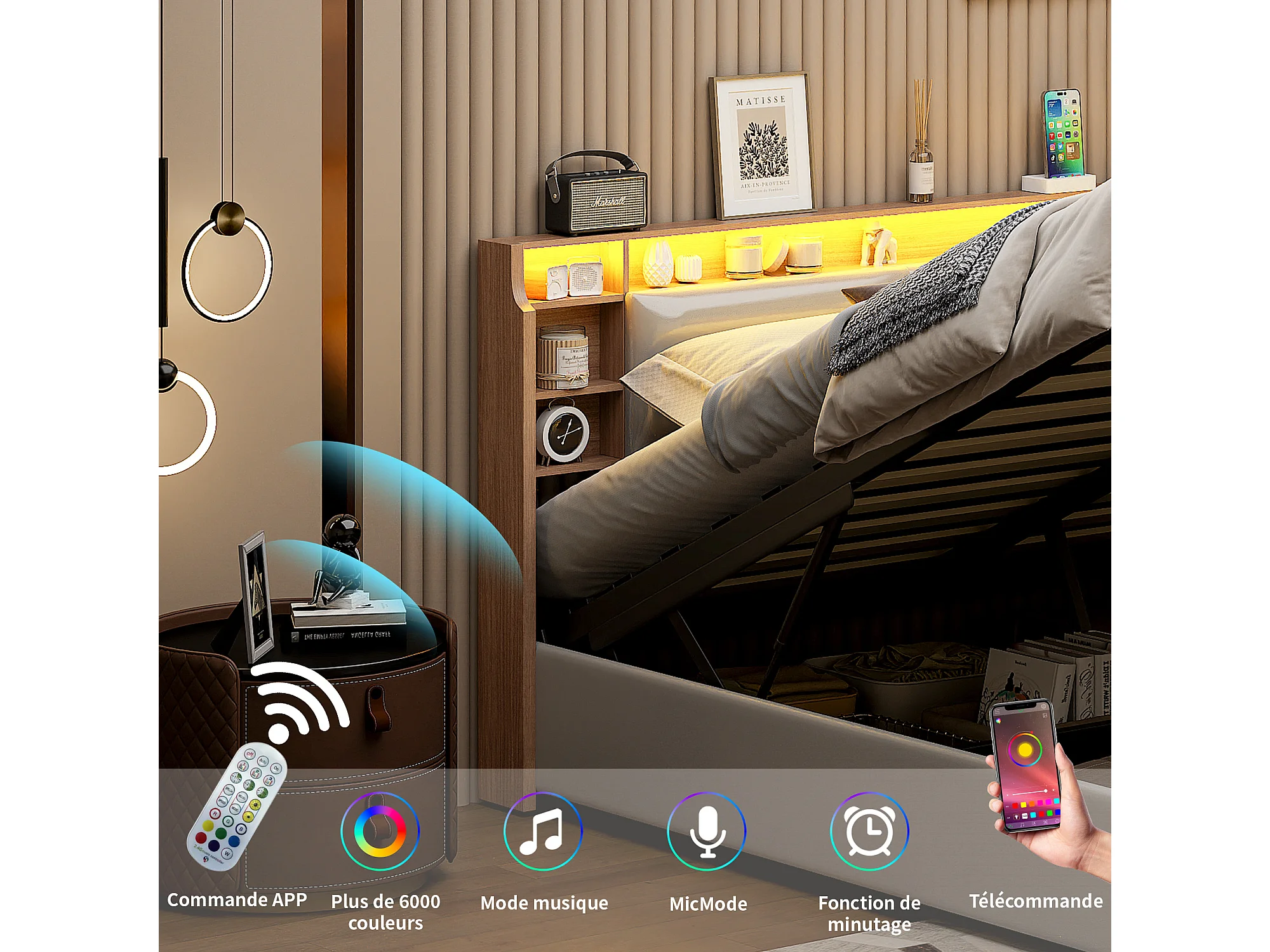 Letto matrimoniale 140x200 cm bianco con contenitore per la testiera e jack box, testiera LED, comandi APP, design moderno e pratico