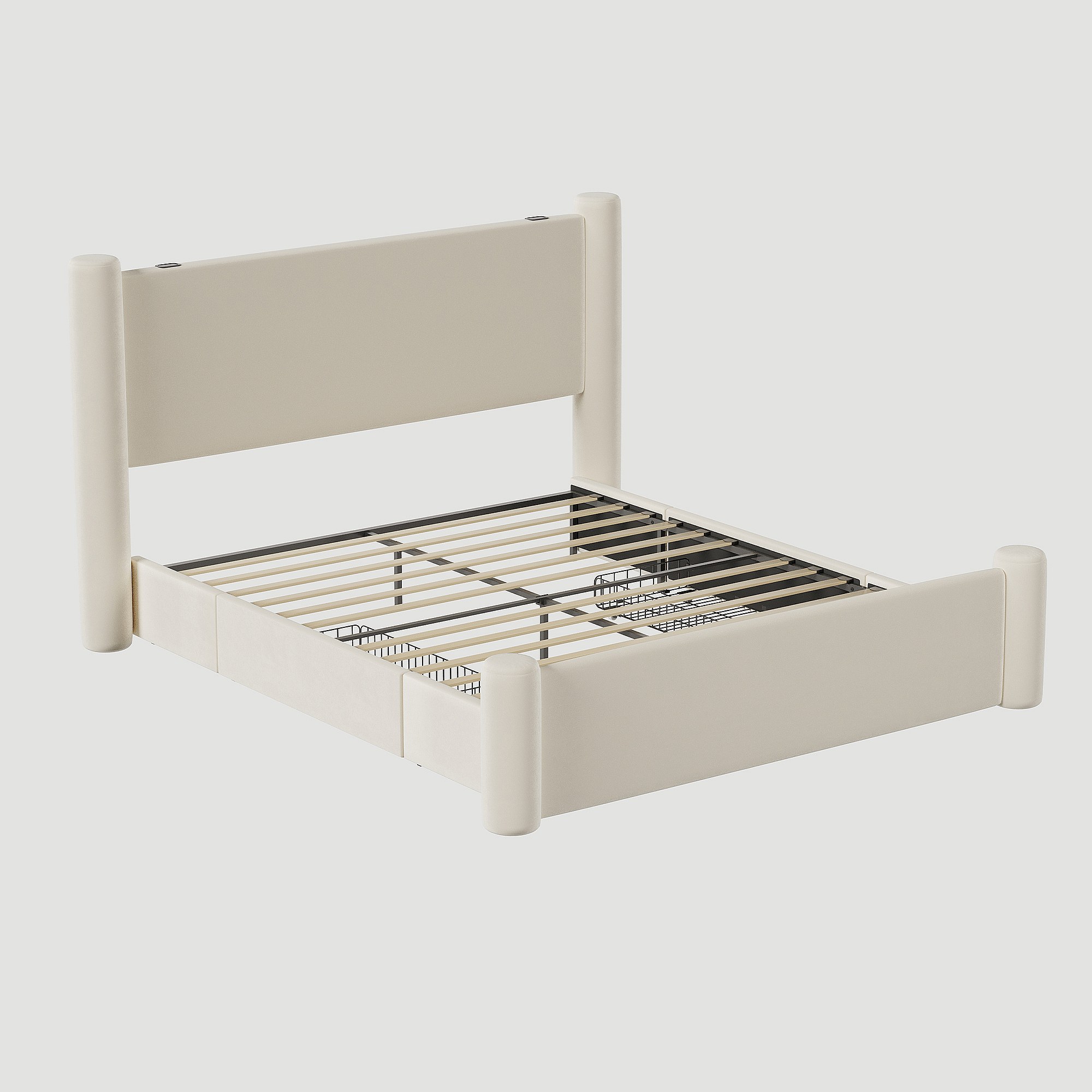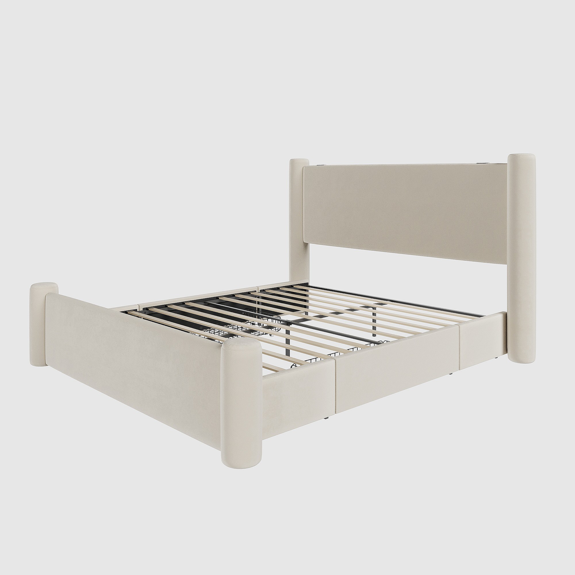 Letto imbottito 140x200 cm - Letto per adulti con 2 cassetti e ricarica USB - gambe cilindriche - velluto beige