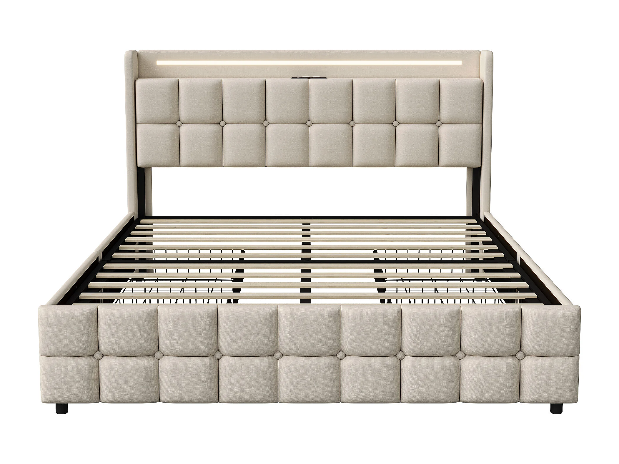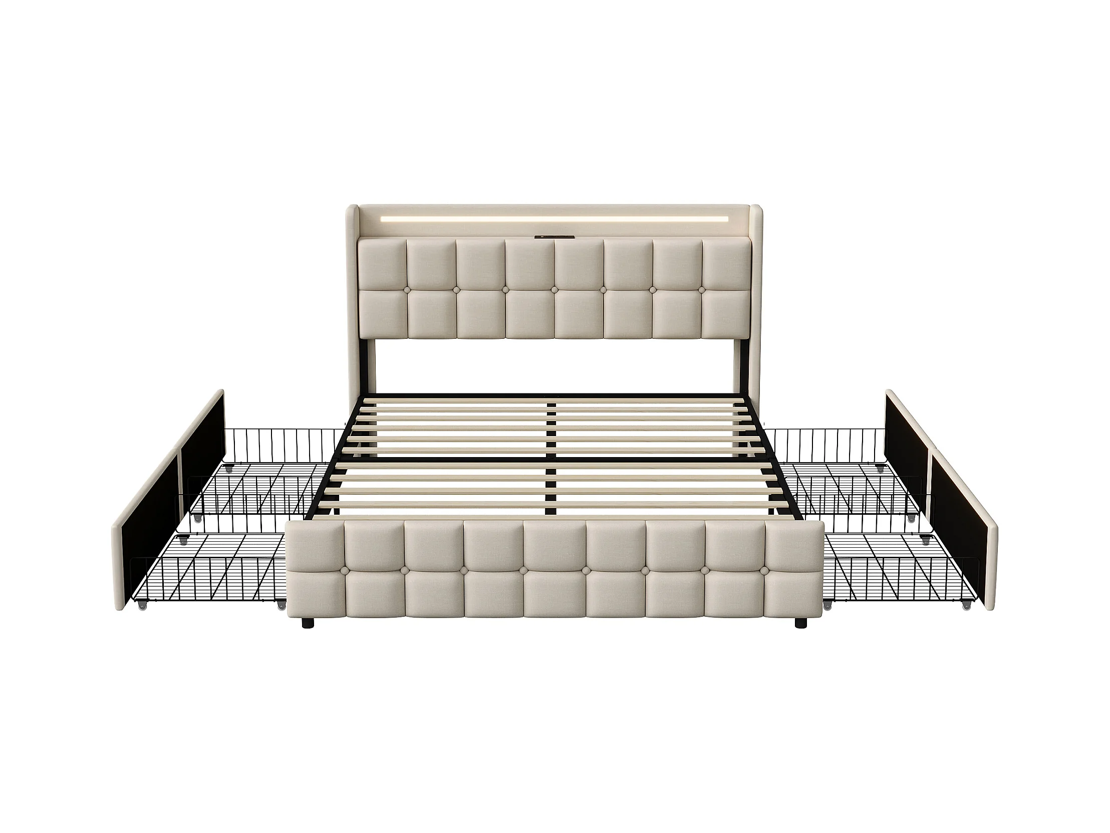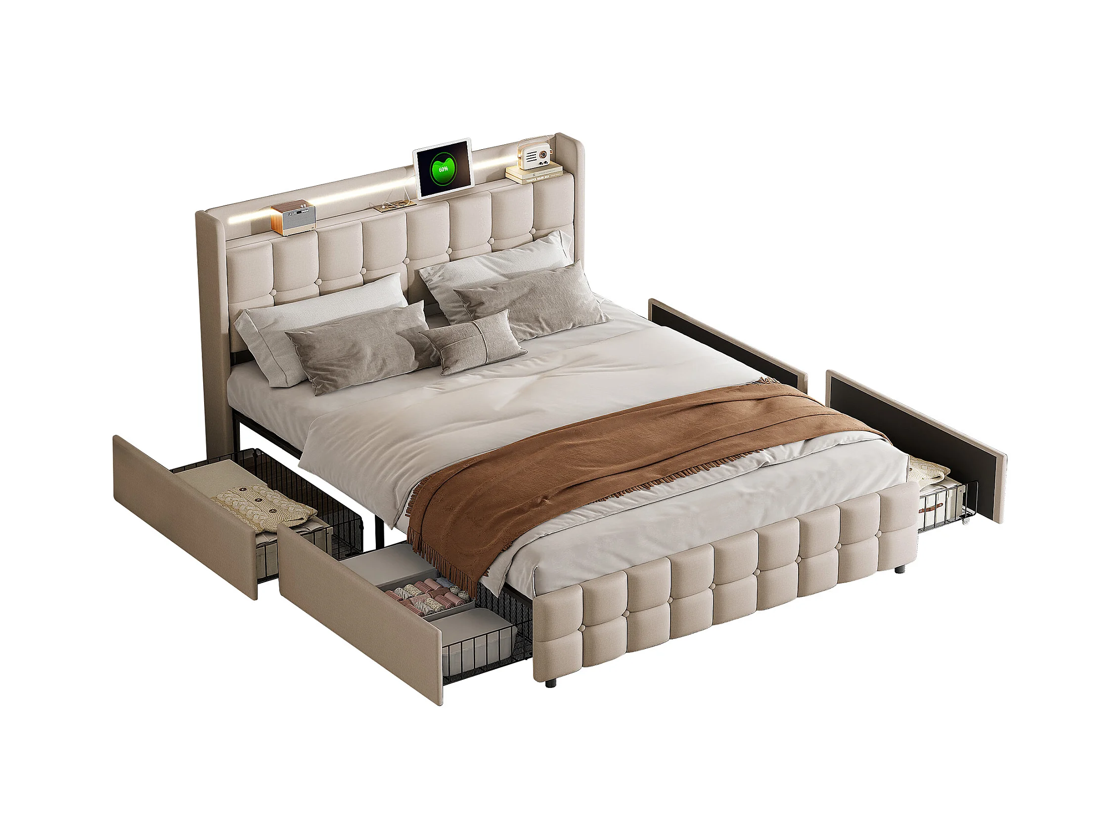 Letto matrimoniale 140x200 cm con LED, 4 cassetti, porta USB, testiera imbottita, tessuto beige, stile moderno.