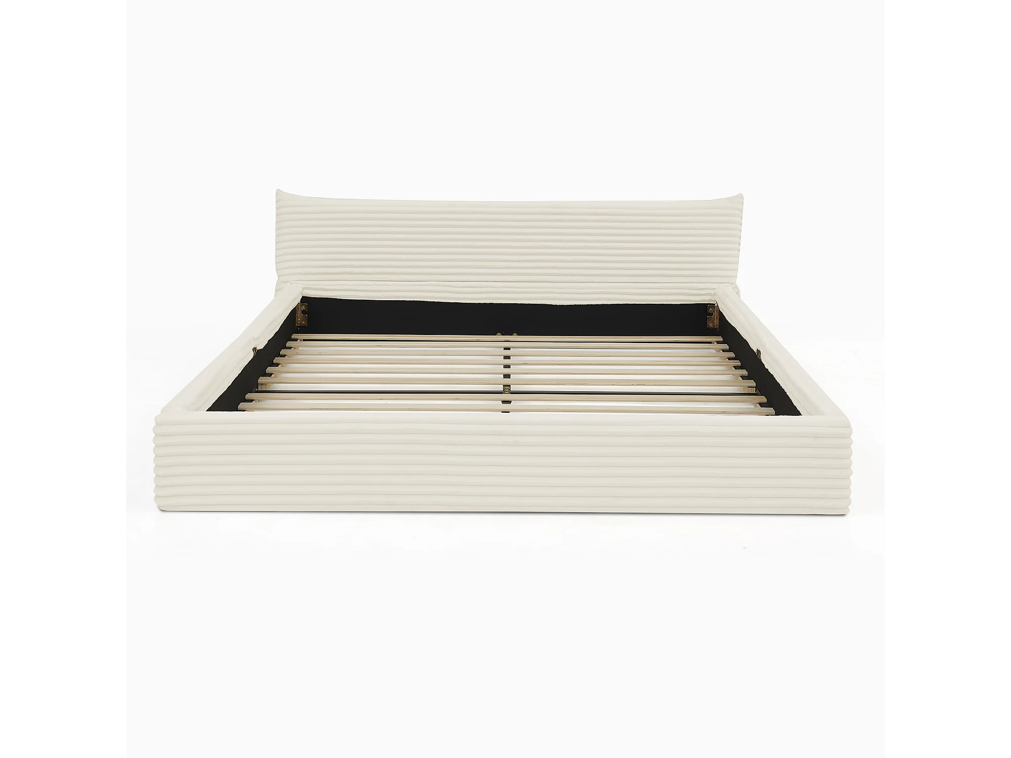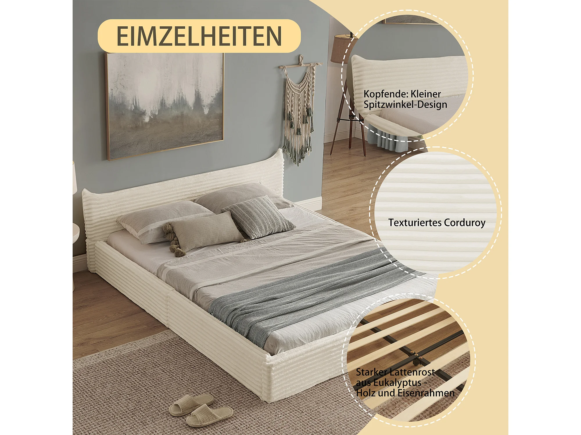 Letto matrimoniale 140×200 cm in velluto a coste classico, elegante testiera con bordo lavorato, struttura in eucalipto ecologico e metallo– Beige
