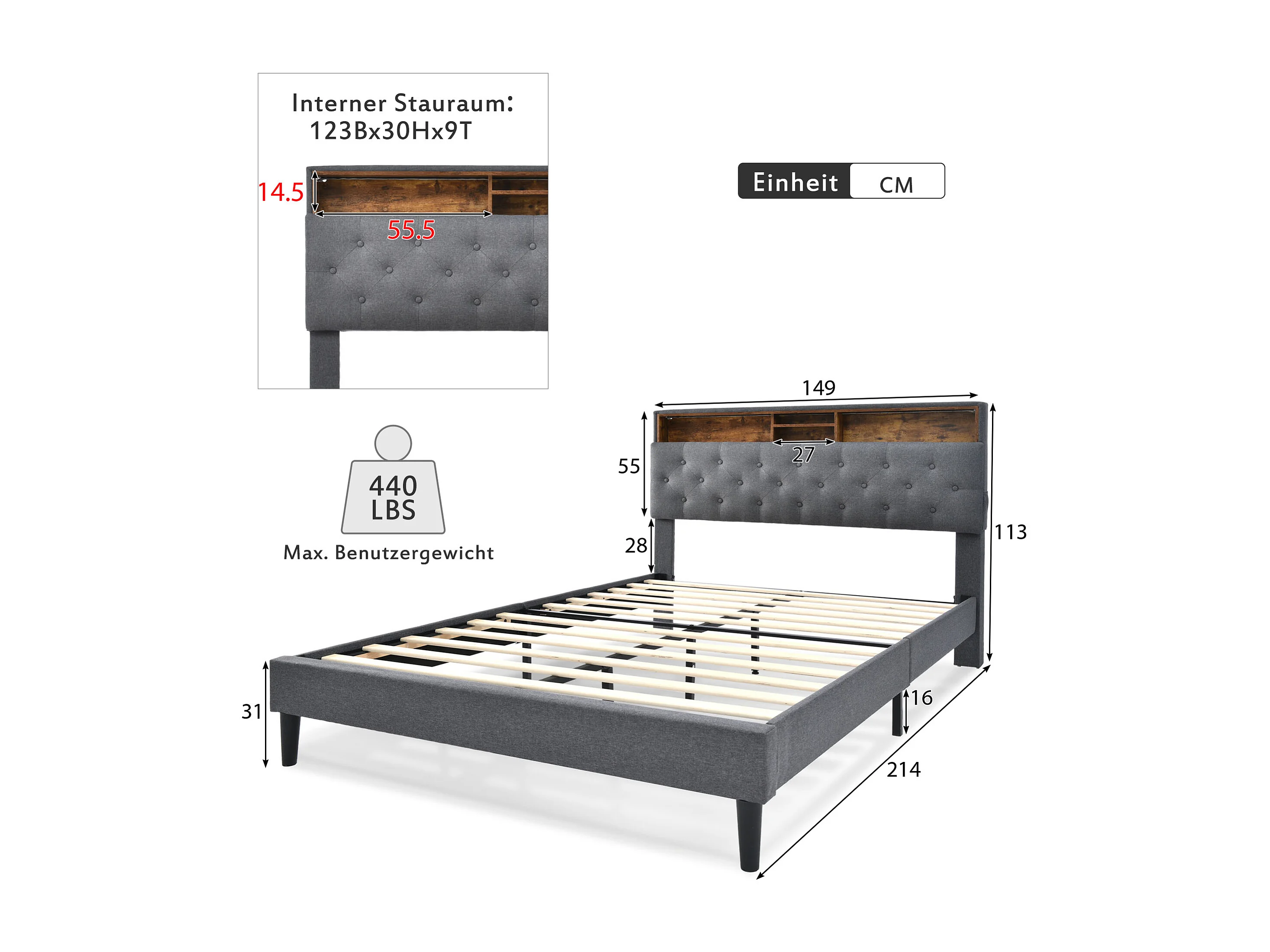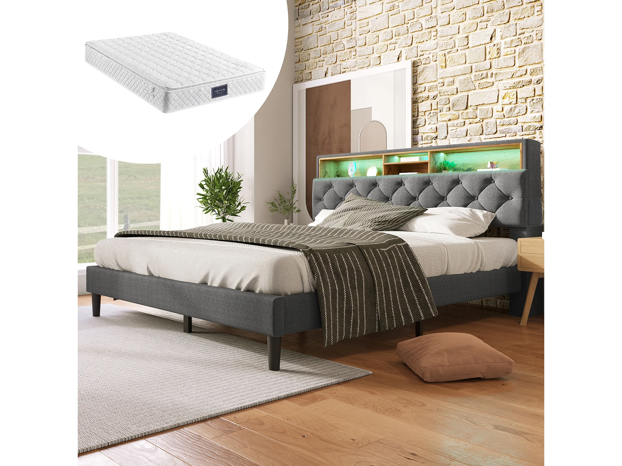 Letto matrimoniale 140x200cm con testiera contenitore e illuminazione a LED - Lino grigio (con materasso)