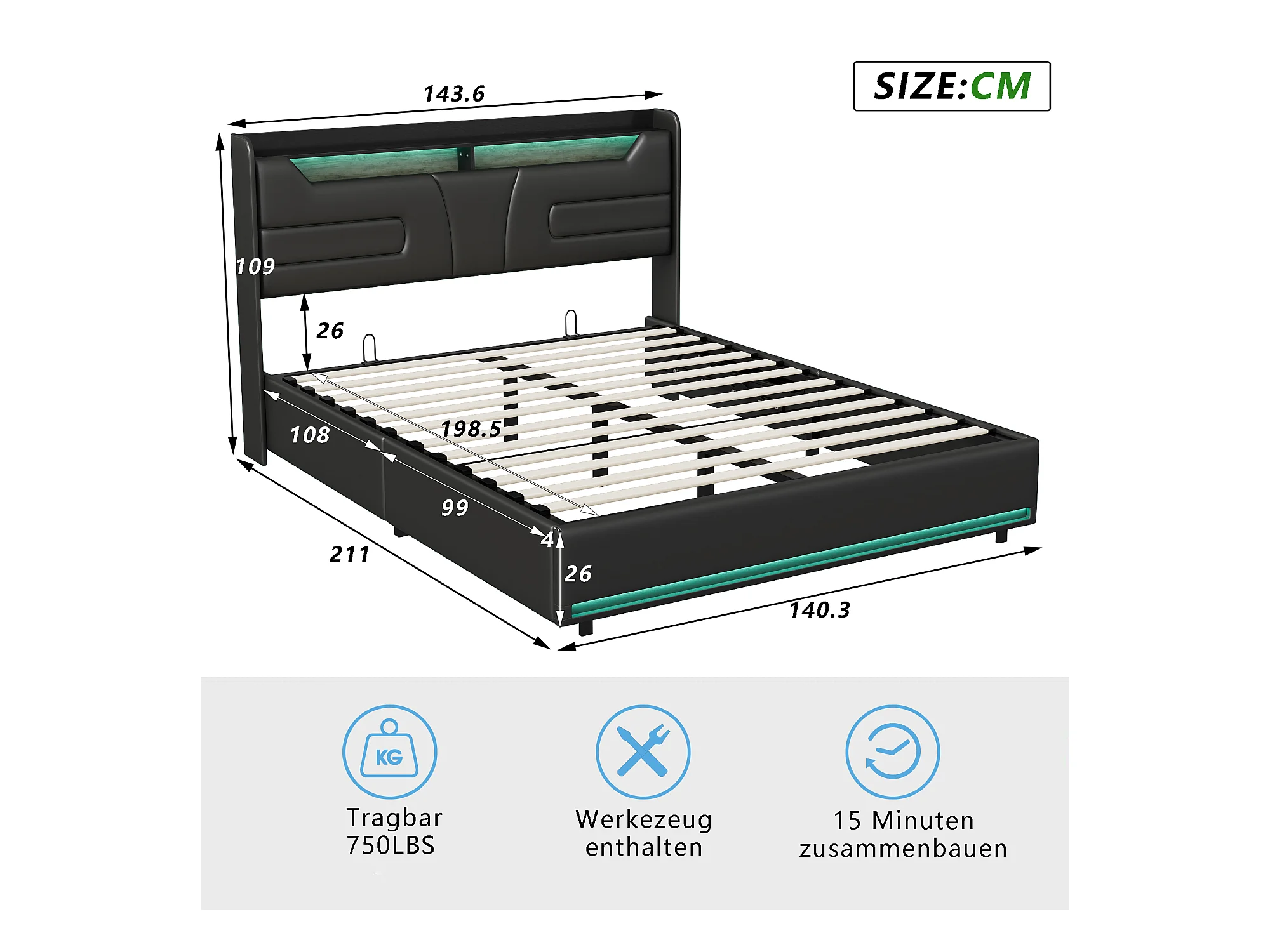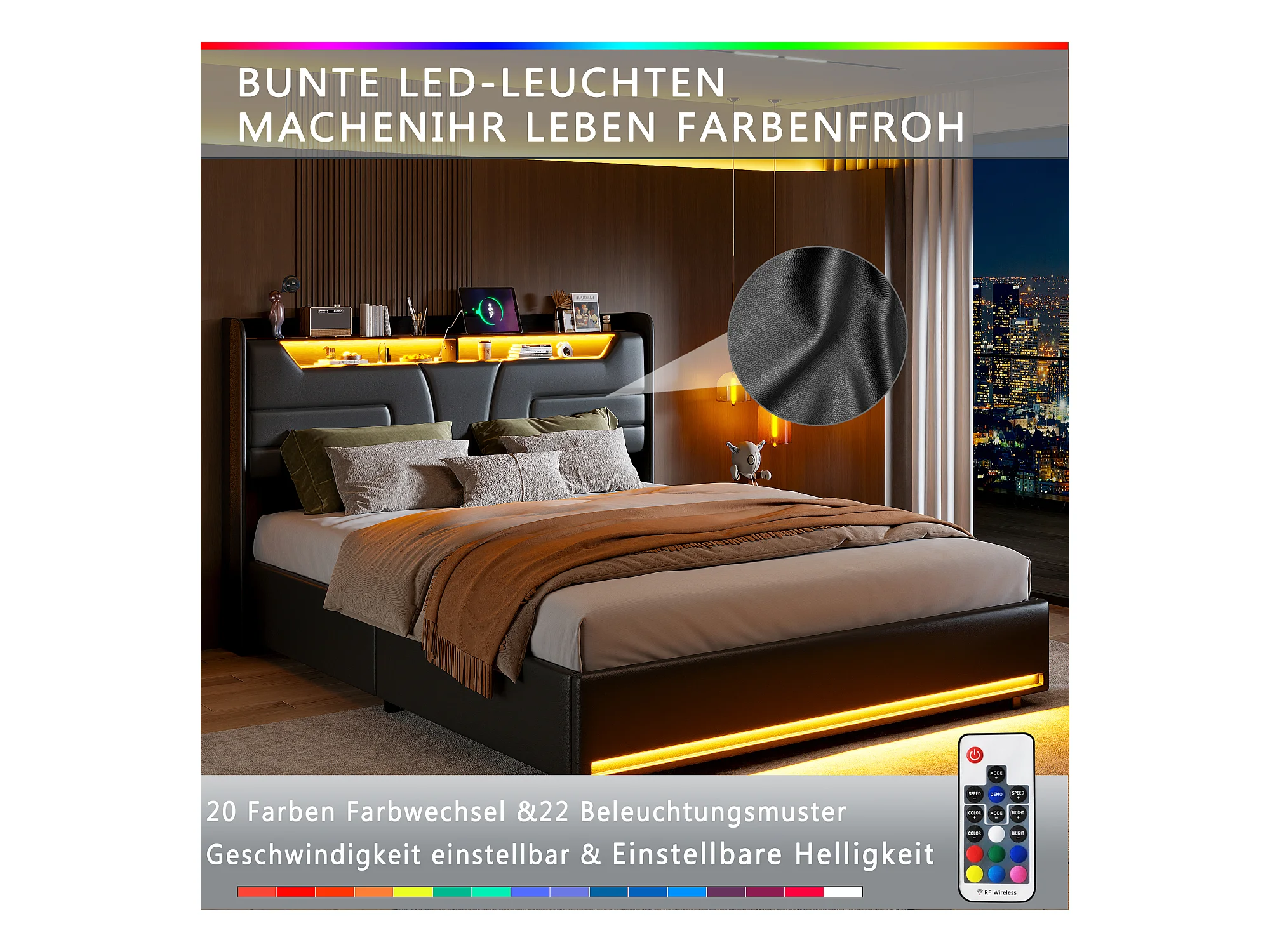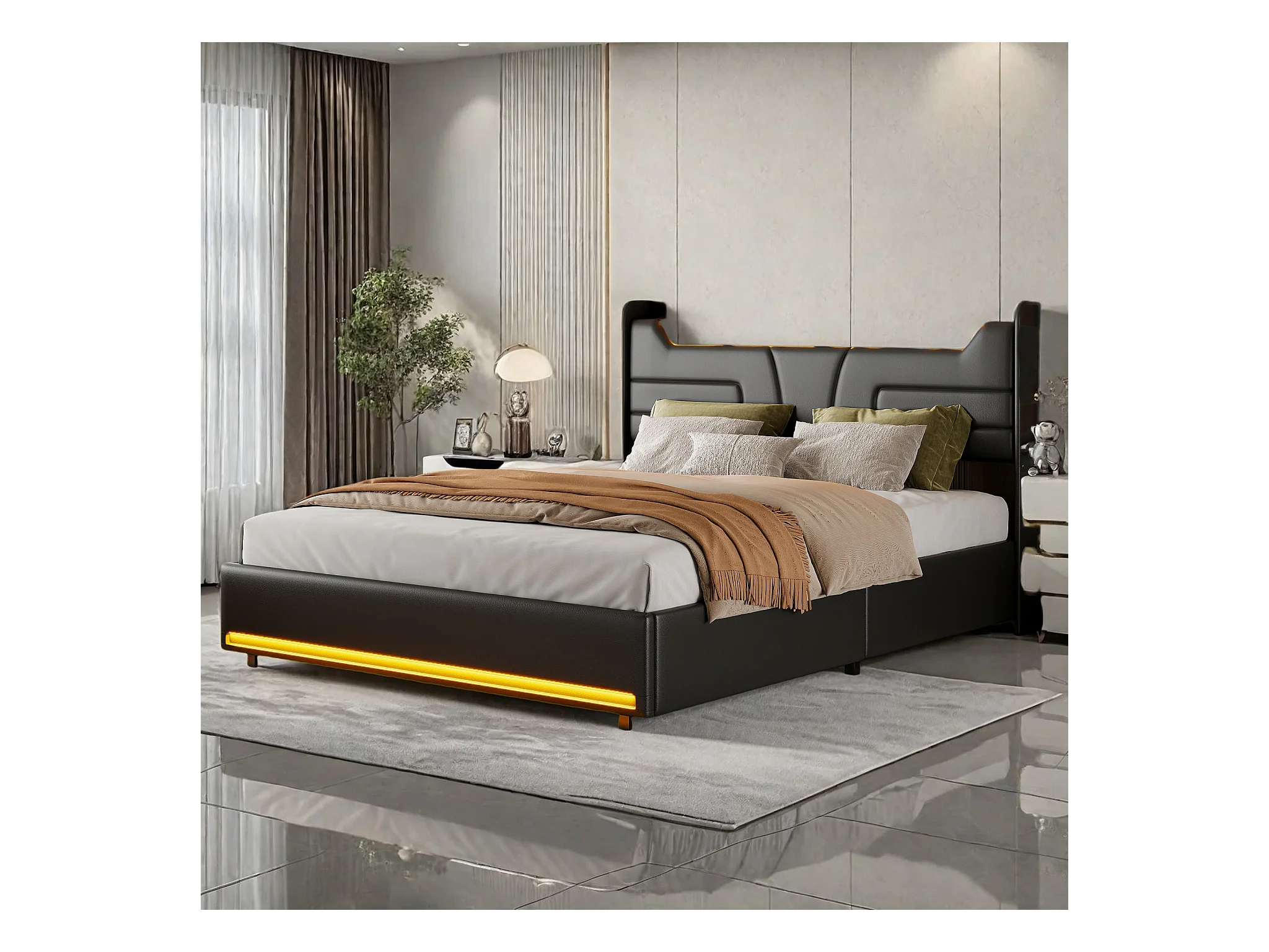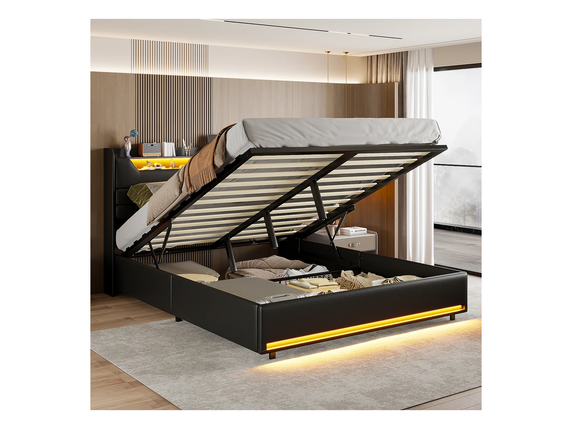 Letto matrimoniale 140x200cm in pelle PU nera con contenitore idraulico, testiera LED con porte di ricarica e striscia luminosa ai piedi del letto
