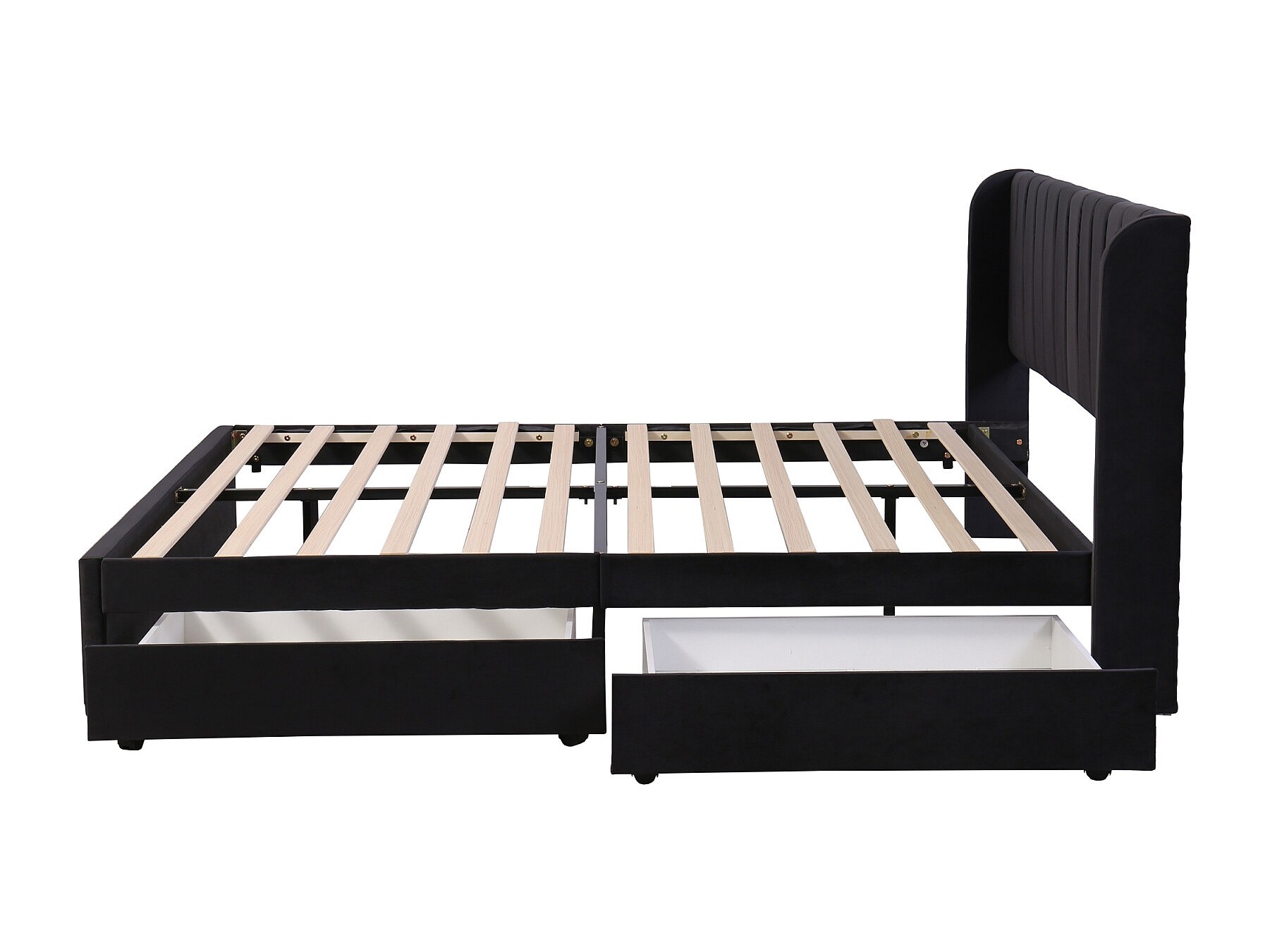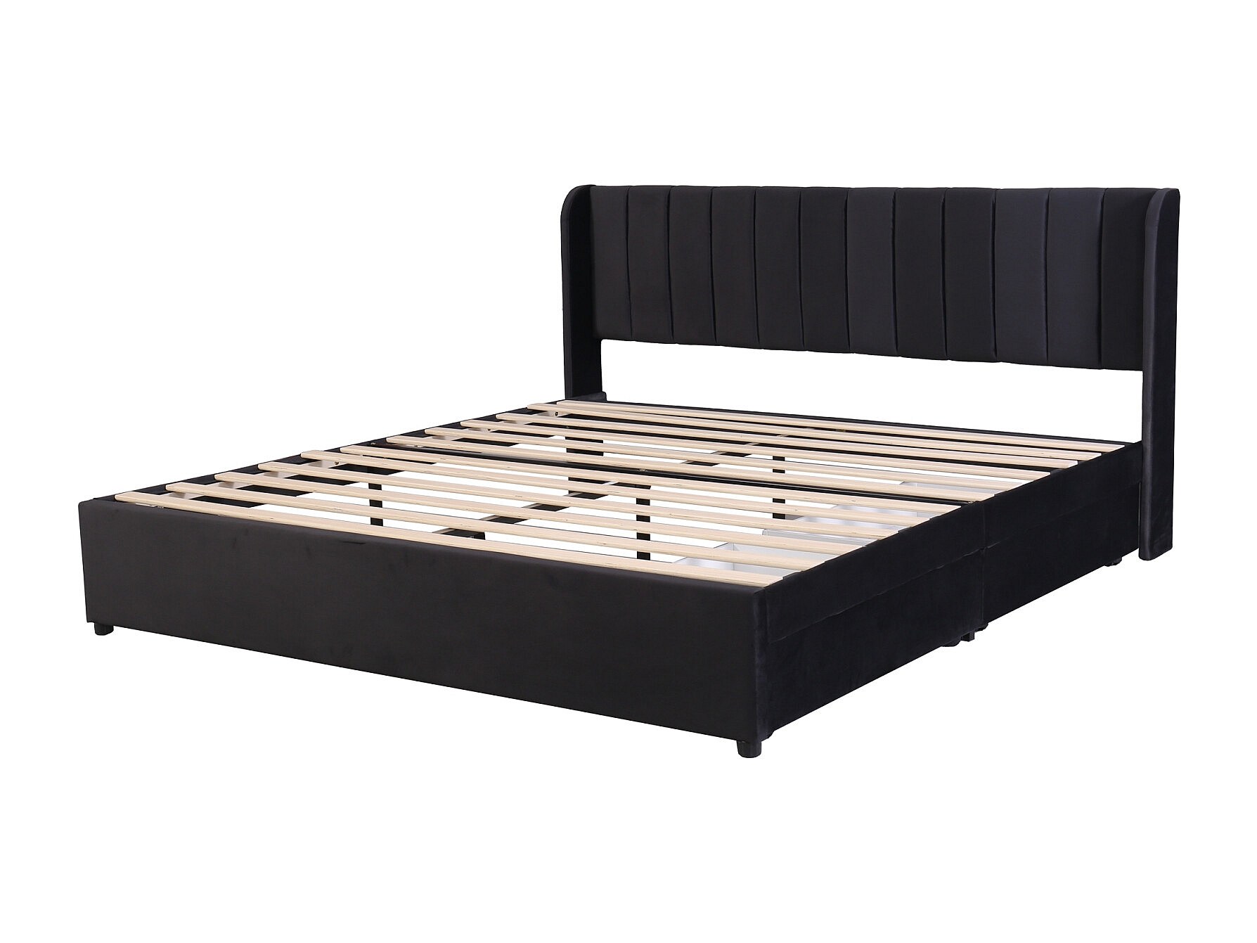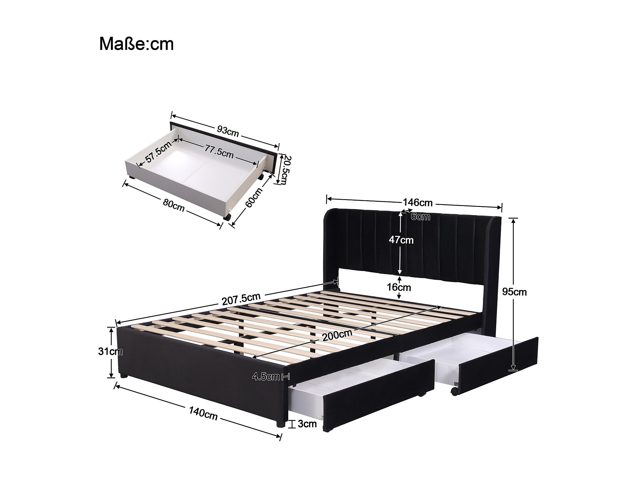 Letto matrimoniale 140x200cm, letto imbottito in velluto, con 2 cassetti, rete a doghe e testiera, nero