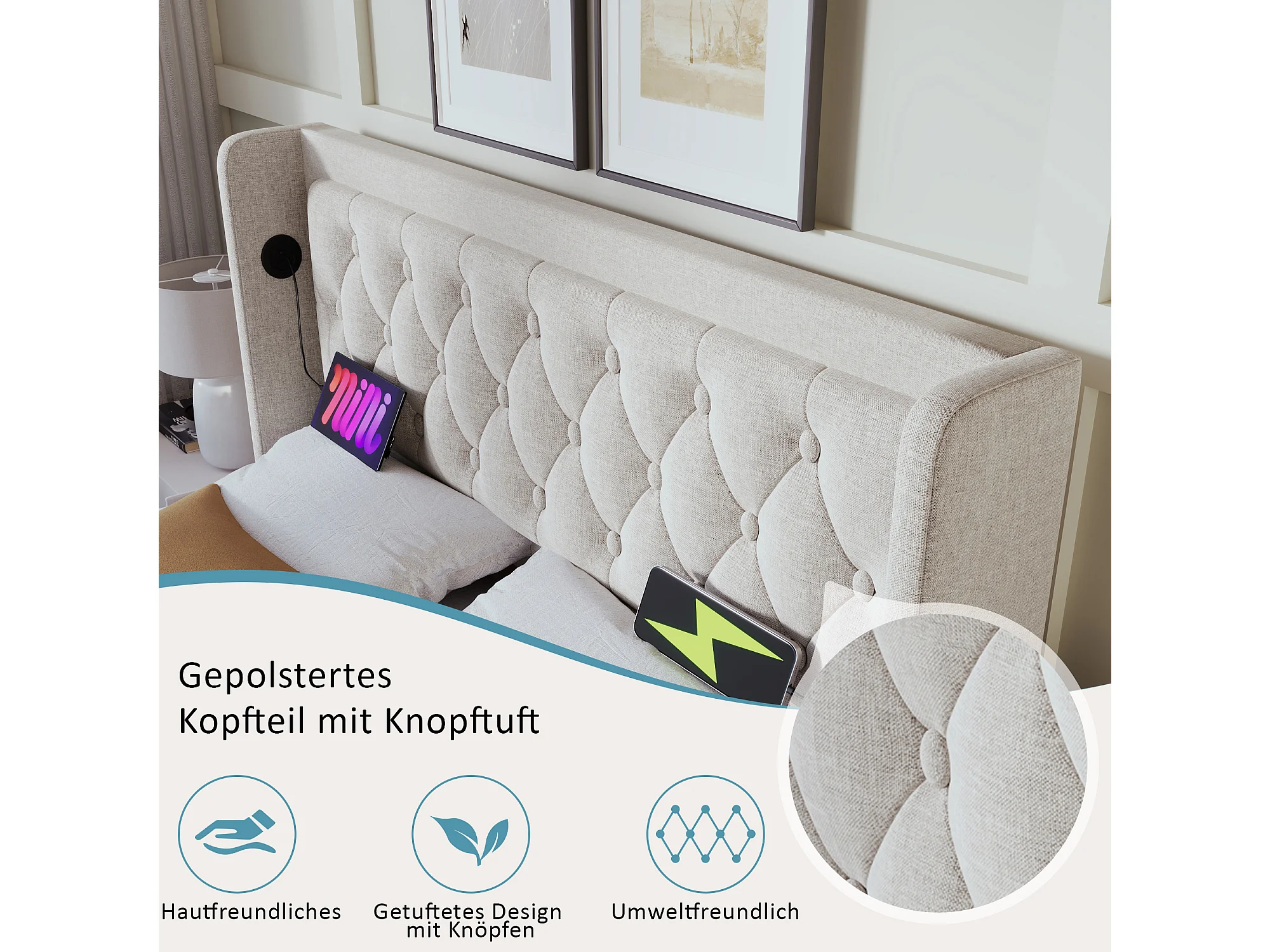 Letto con funzione di ricarica USB Type-C, illuminazione a LED, testiera con contenitore, tessuto di cotone beige, 160x200 cm (Dimensioni: 208x170x104 cm)