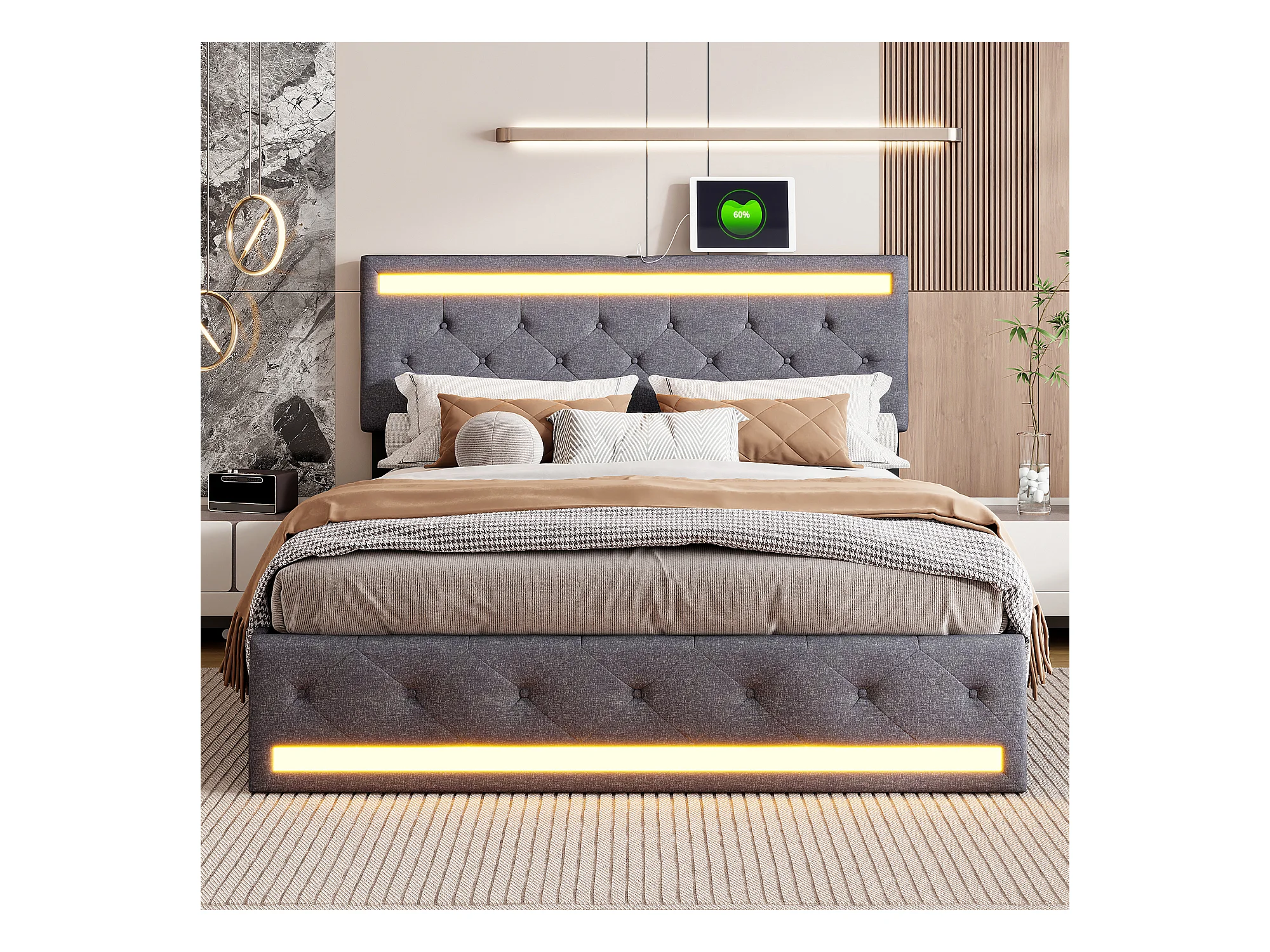 Letto matrimoniale 160x200 cm, 2 cassetti e contenitore nella testiera, LED e ricarica USB, lino grigio.