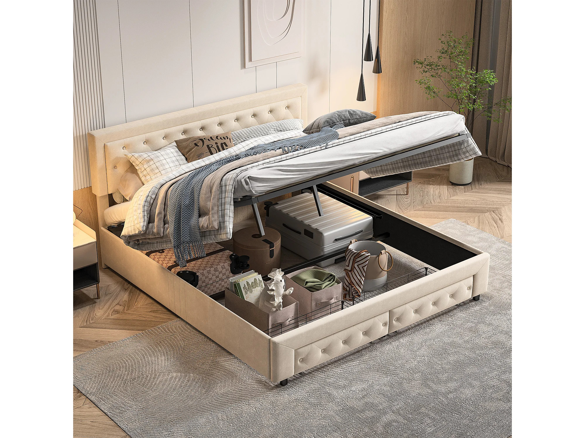 Letto matrimoniale 160 x 200 cm con contenitore e cassetti, velluto, rete a doghe, letto idraulico, beige