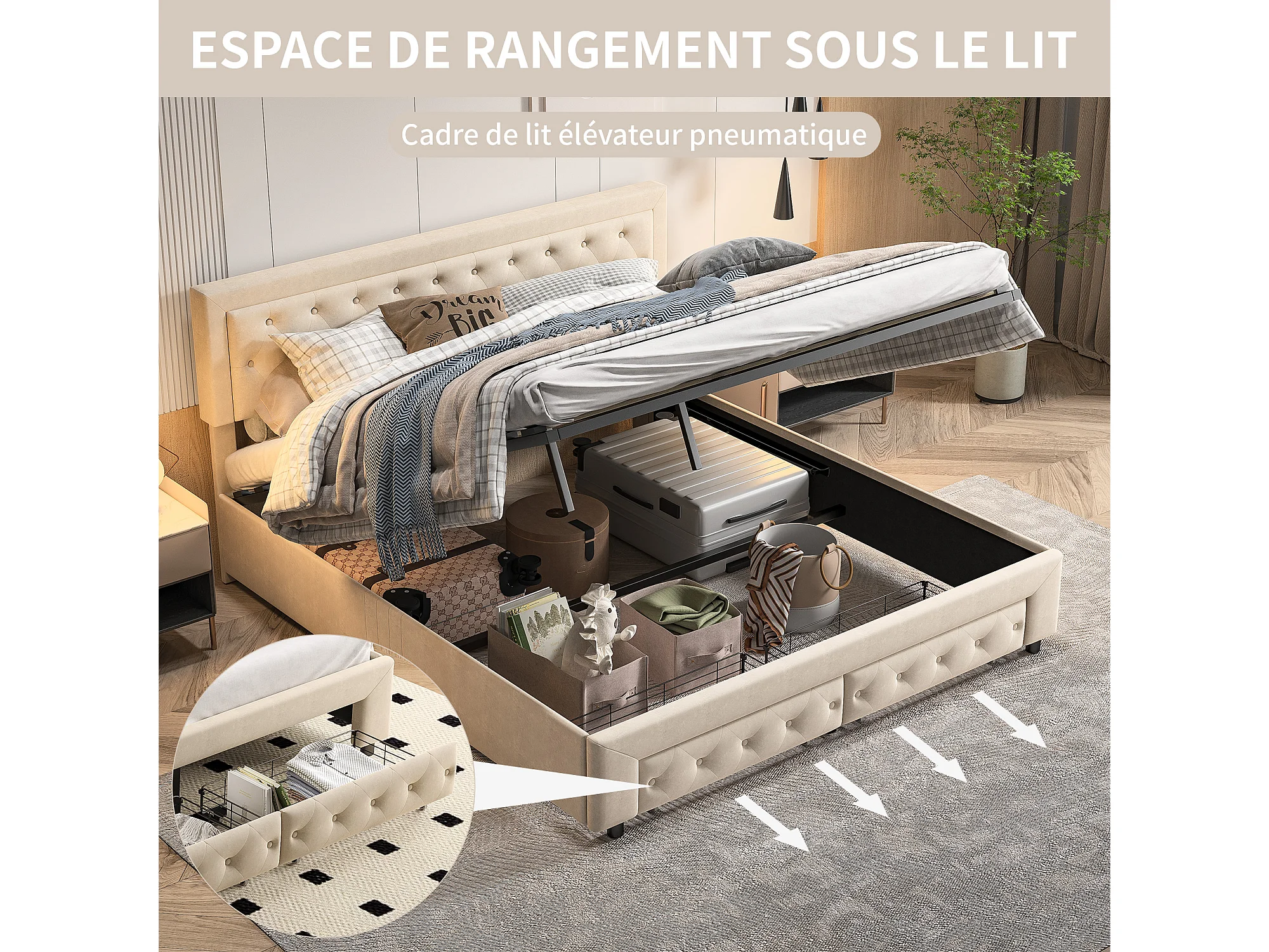 Lit double 160x200 in velluto beige, lit rembourré oreille con coffre hydraulique et sommier à lattes
