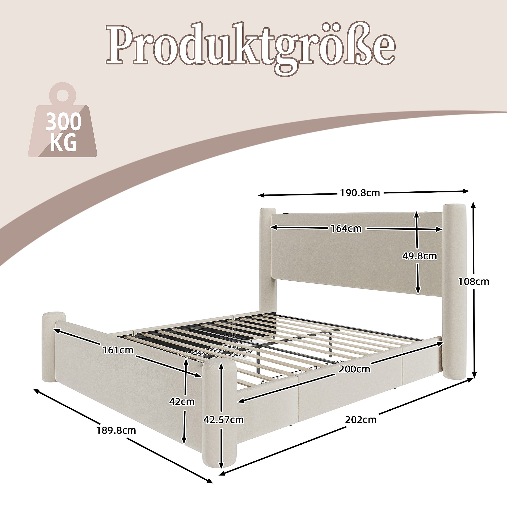 Letto per adulti 160x200 cm con 4 cassetti e porta USB tipo C, testiera regolabile, rivestito in velluto beige, senza materasso