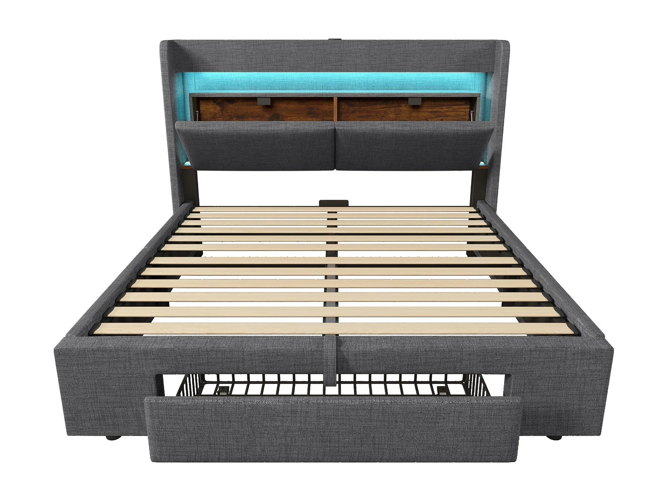 Letto matrimoniale 160x200 cm con contenitore in lino grigio - Letto per adulti con illuminazione a LED, porte USB e testiera contenitore