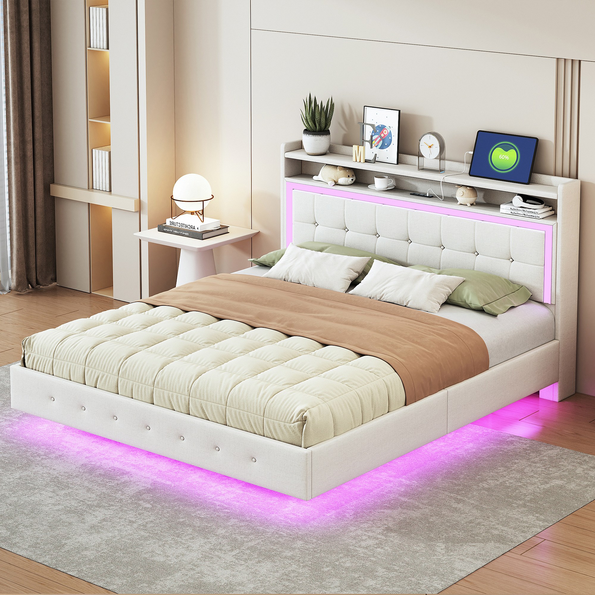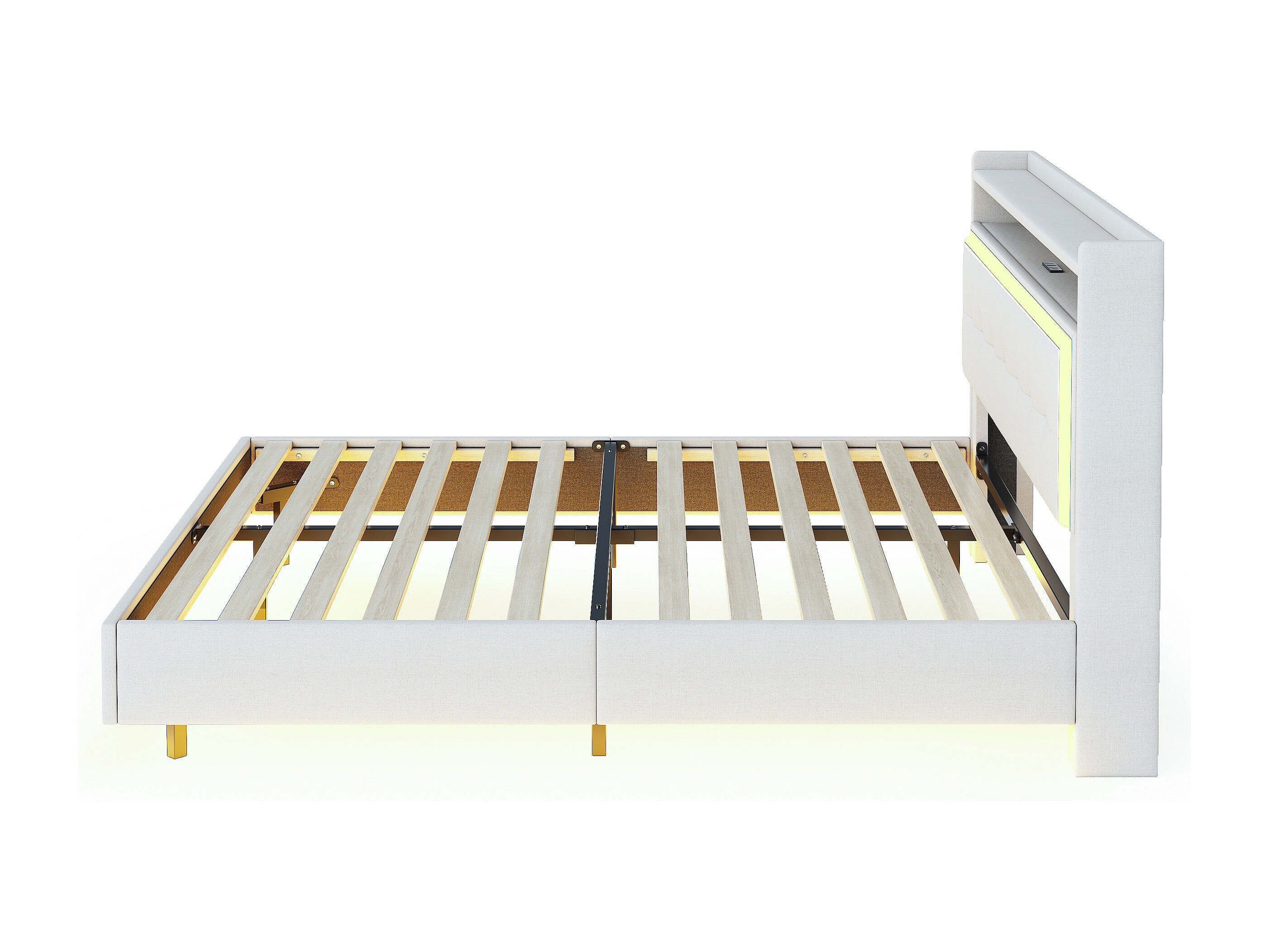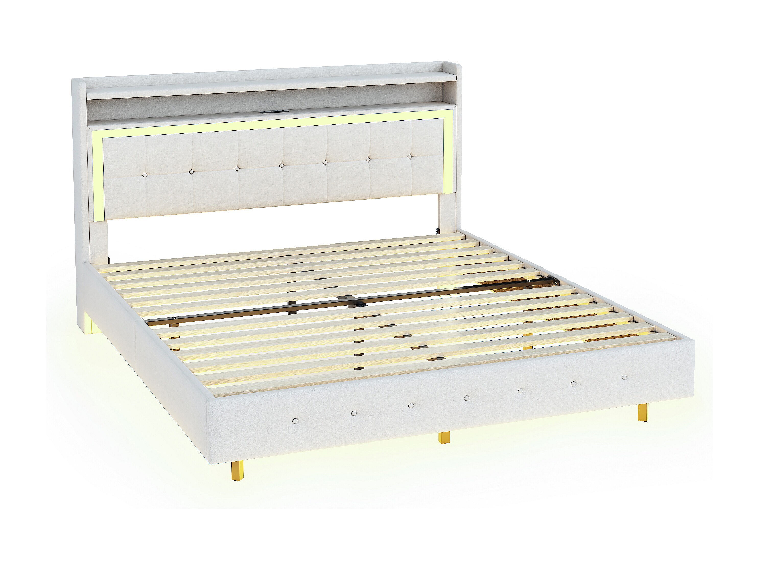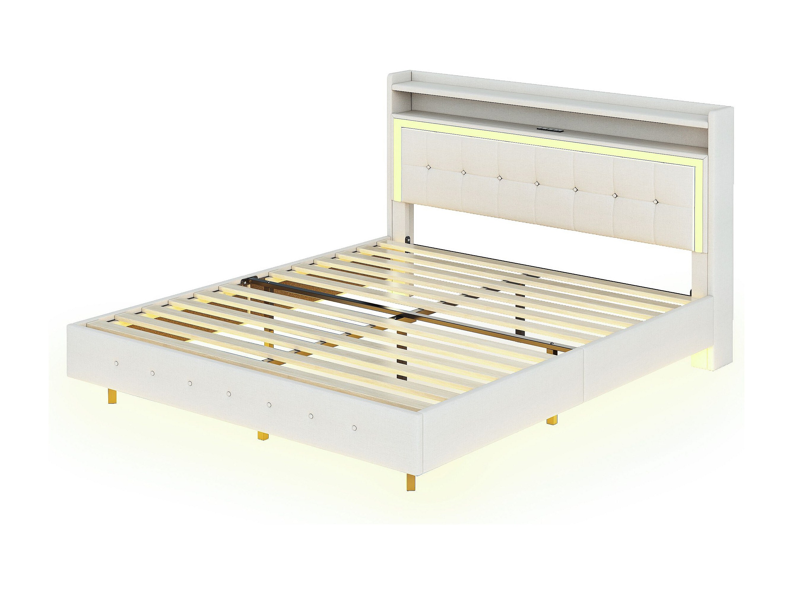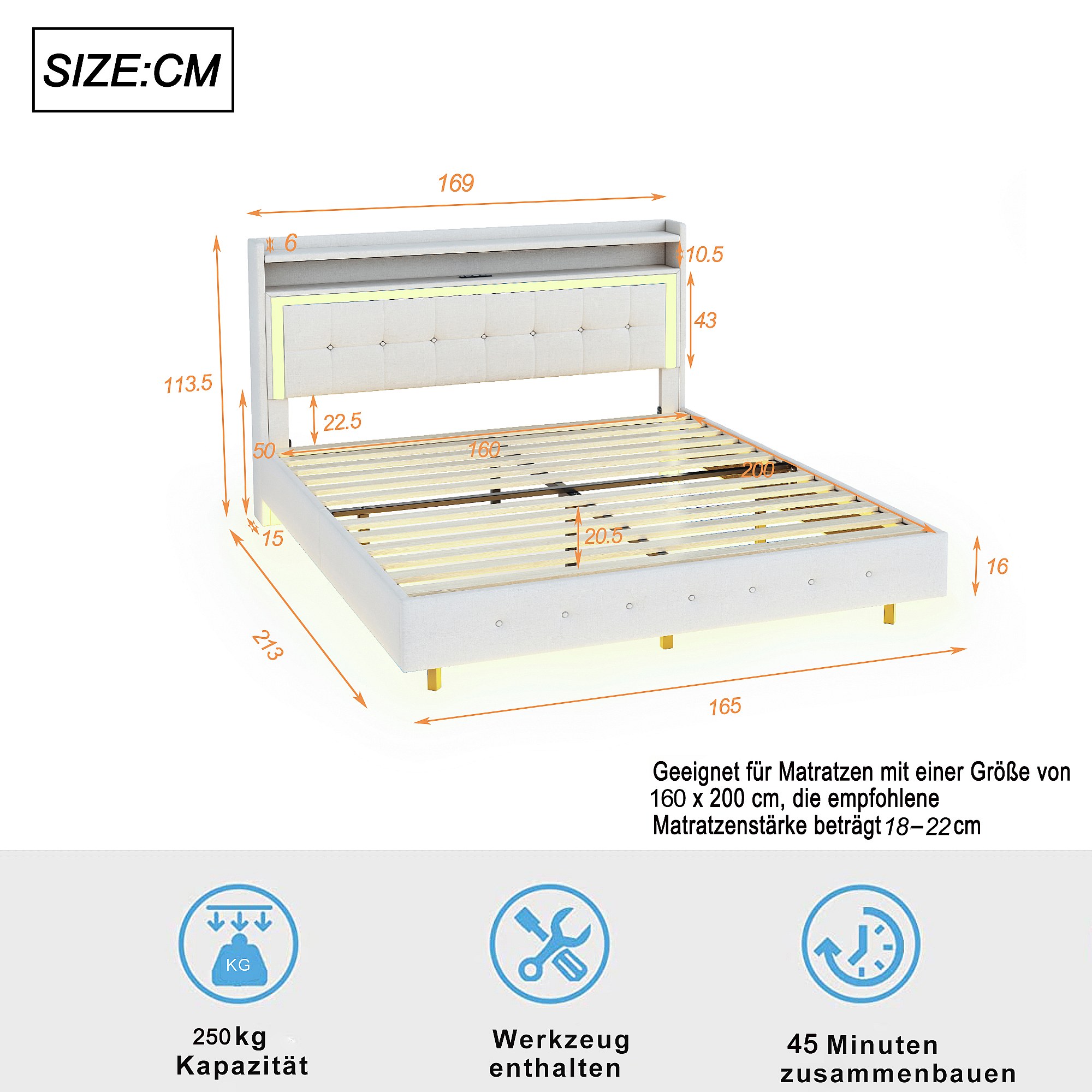 Letto per adulti 160x200 cm - letto flottante con LED e 2 porte USB + rete a doghe - tessuto di lino - Beige