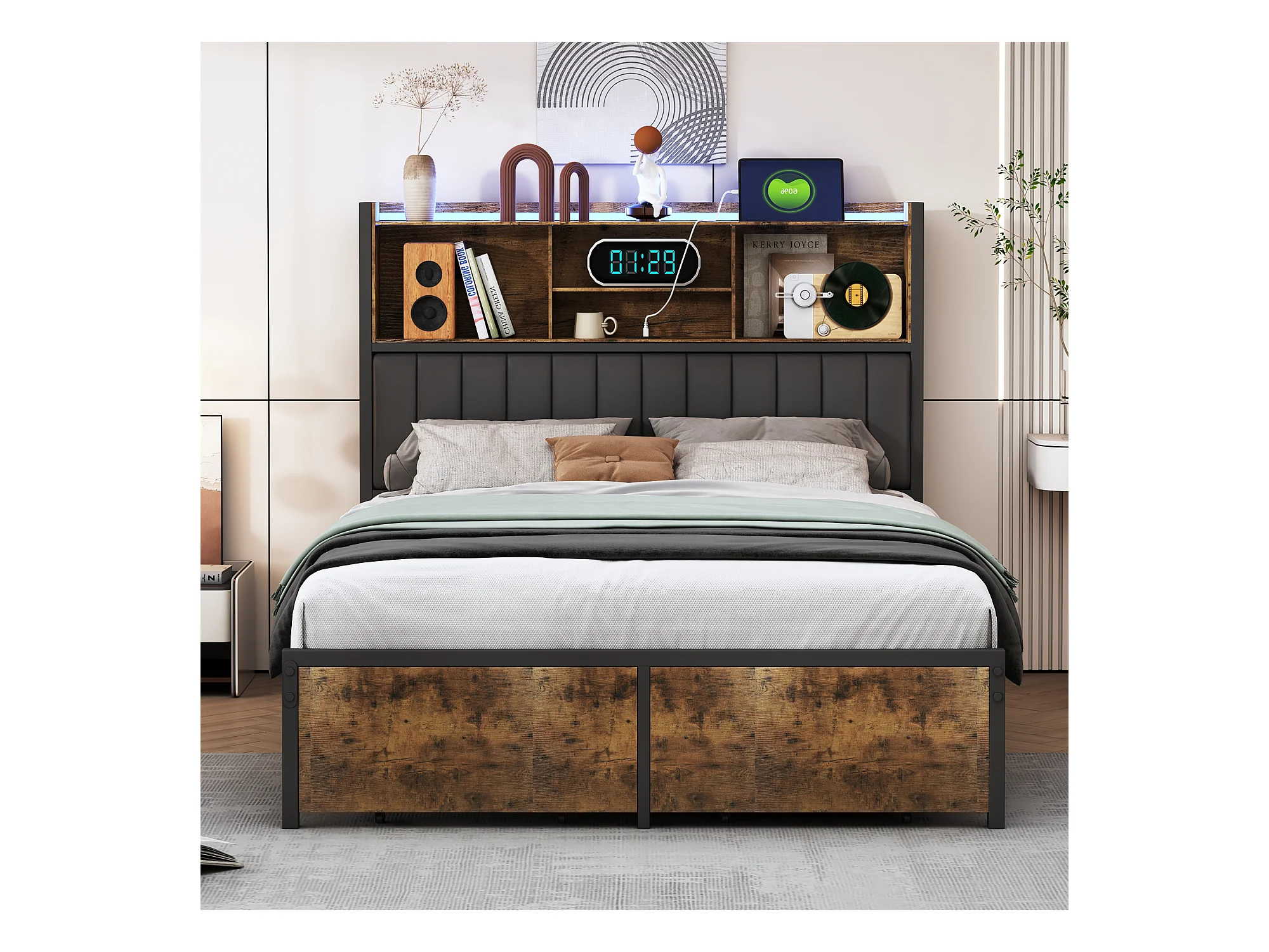 Letto matrimoniale 160x200 cm in metallo e legno con testiera imbottita in PU, illuminazione LED RGB, stazione di ricarica USB/Type-C e 2 cassetti portaoggetti