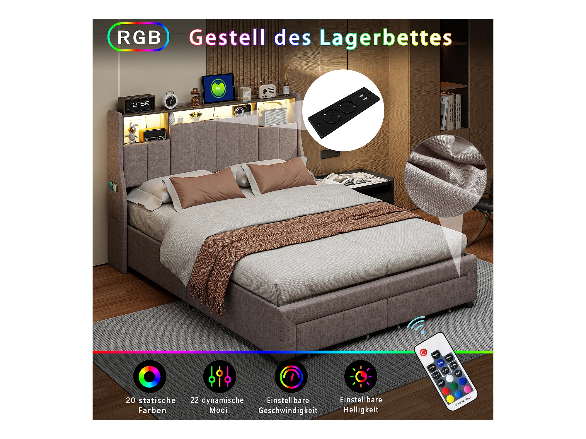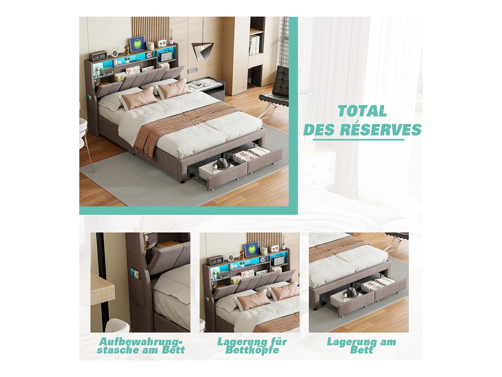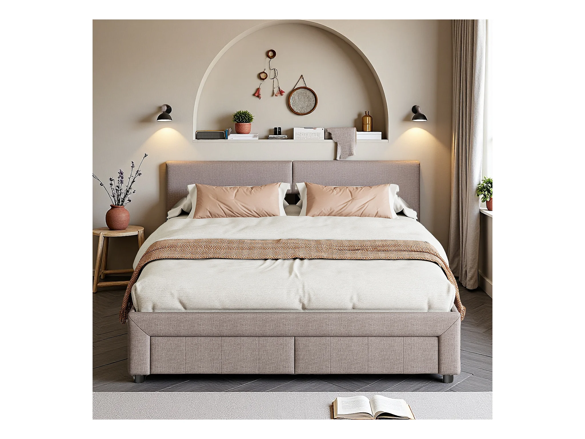 Letto matrimoniale 160x200 cm in tessuto effetto lino grigio con 2 cassetti, testiera con tasche laterali, contenitore integrato e illuminazione LED ambientale