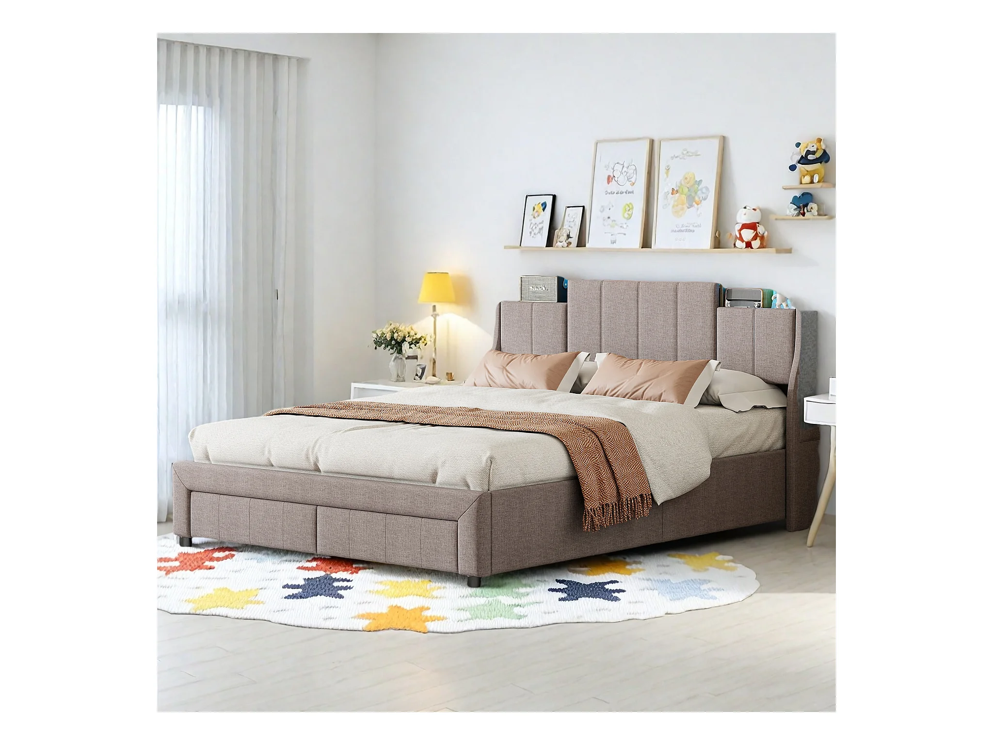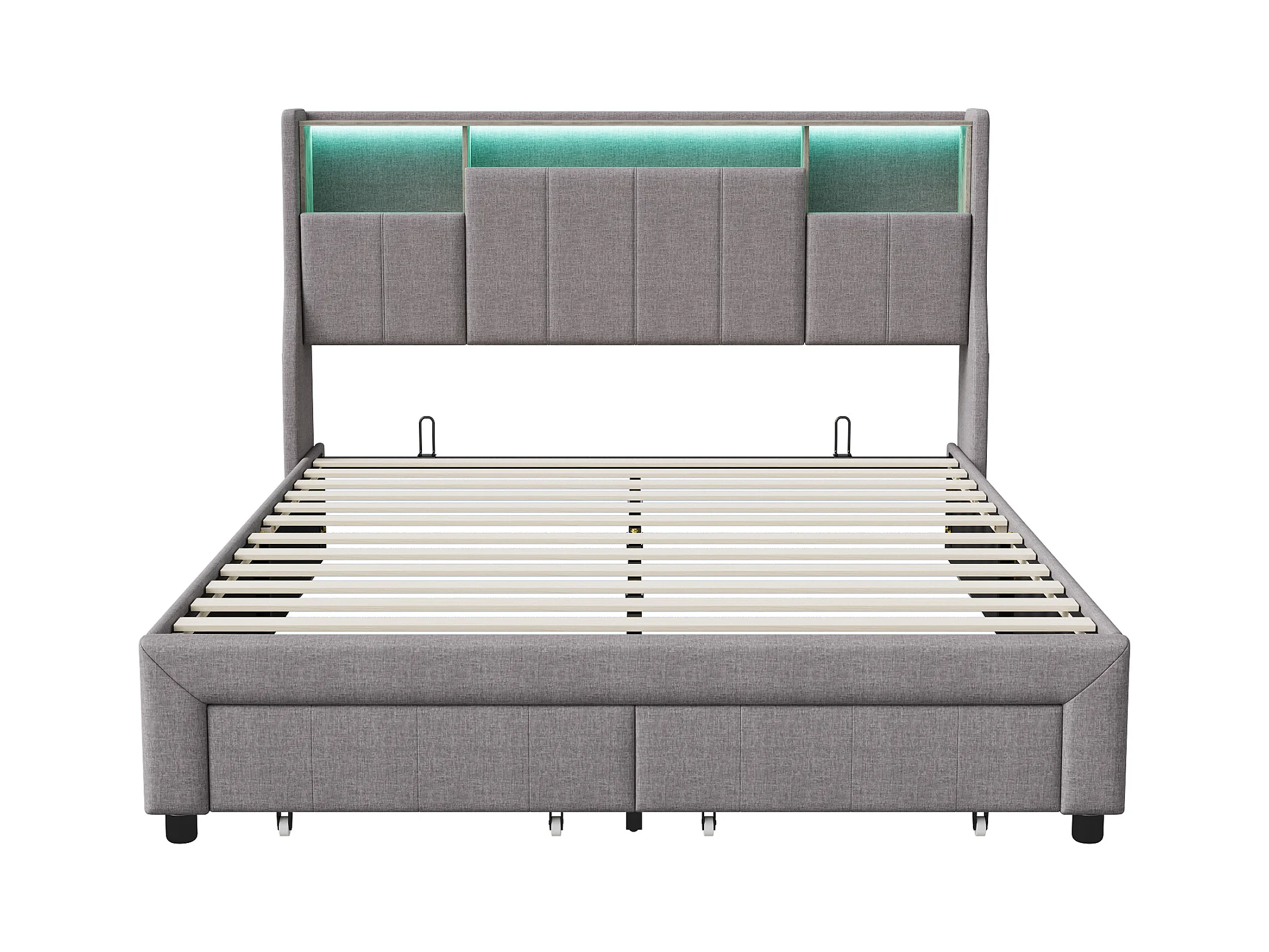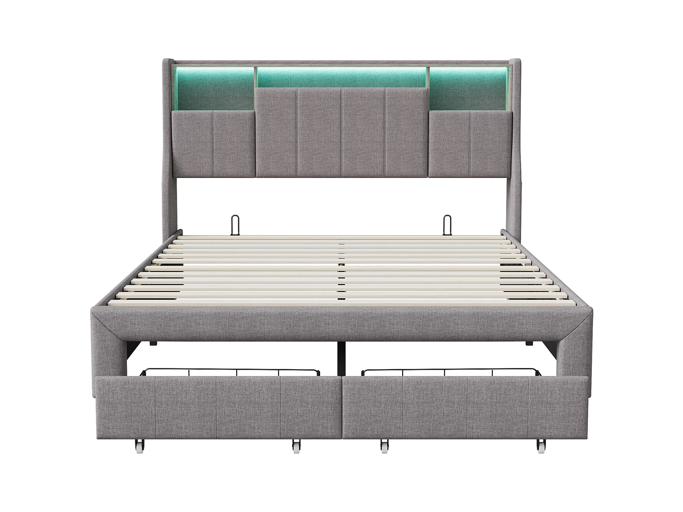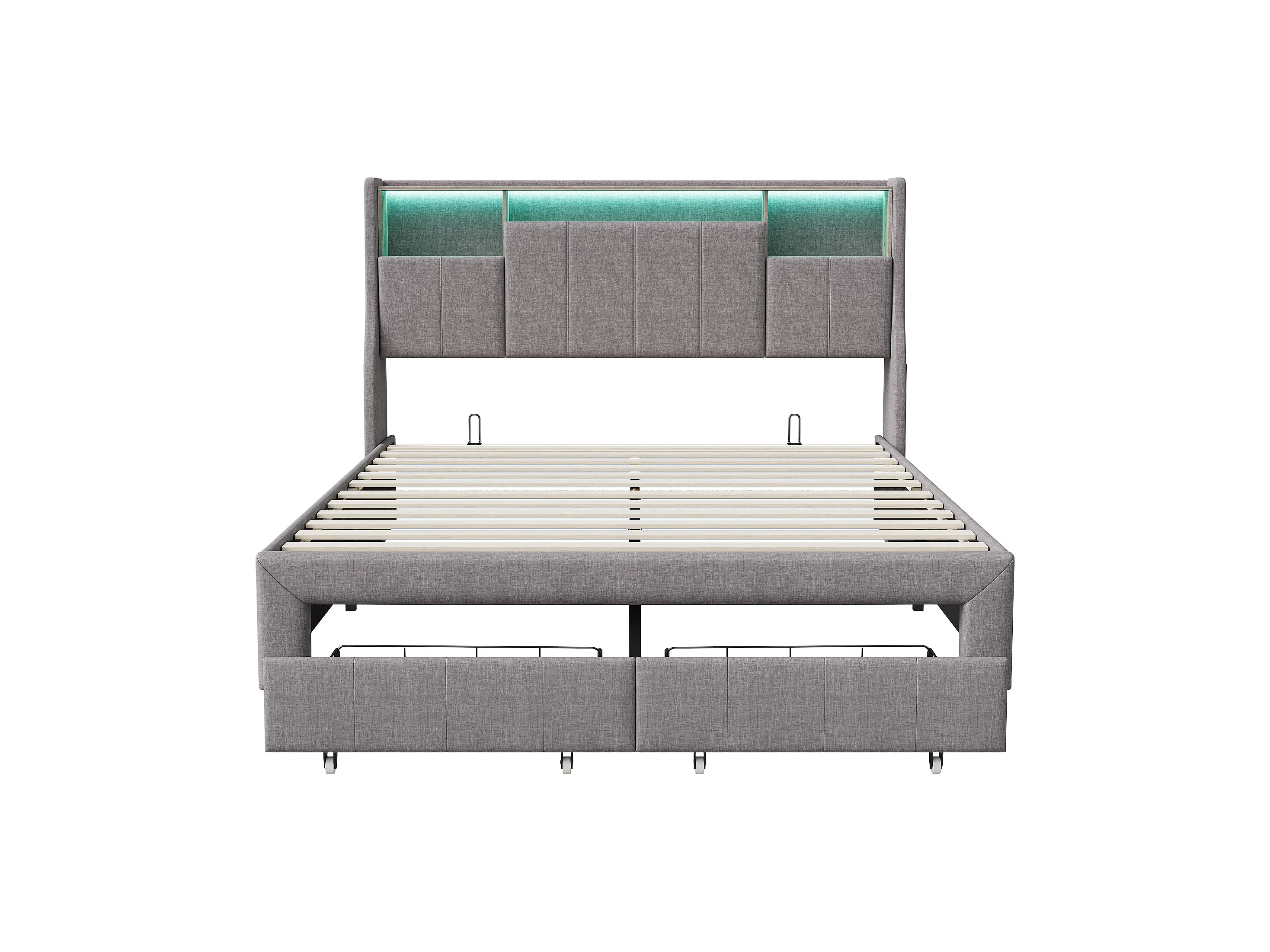 Letto matrimoniale 160x200 cm in tessuto effetto lino grigio con 2 cassetti, testiera con tasche laterali, contenitore integrato e illuminazione LED ambientale