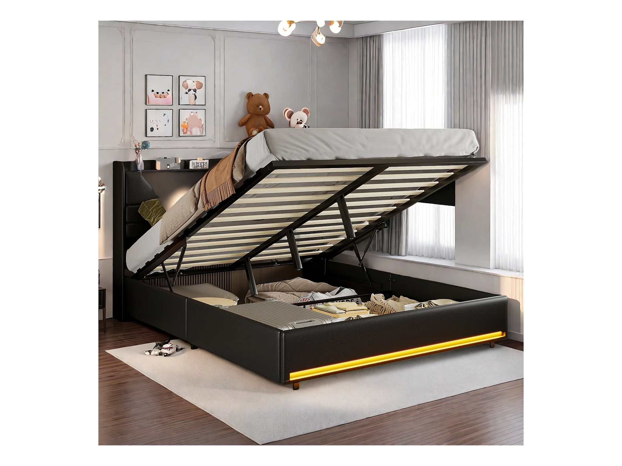 Letto matrimoniale 160x200cm in pelle PU nera con contenitore idraulico, testiera LED con porte di ricarica e striscia luminosa ai piedi del letto