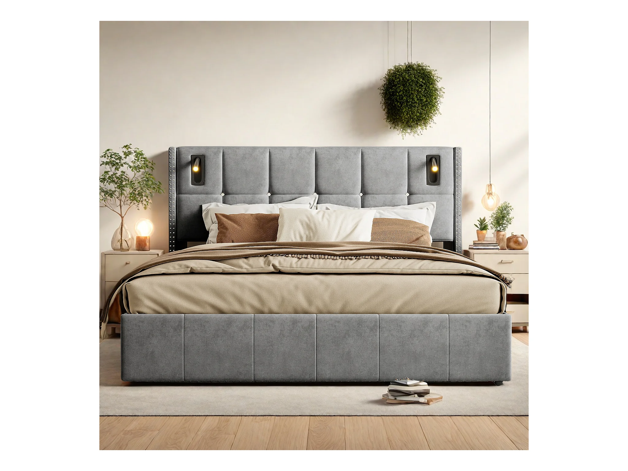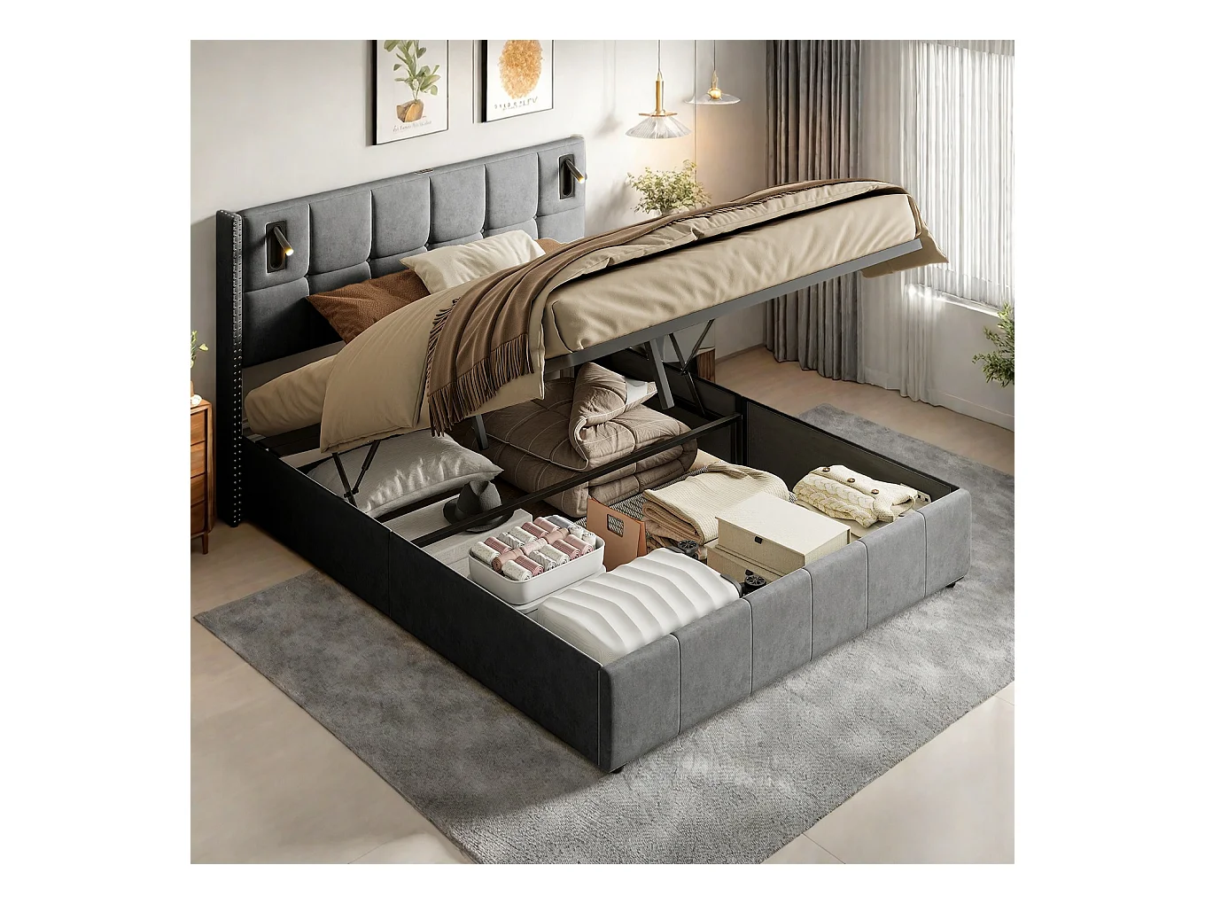Letto matrimoniale 160x200cm in velluto grigio con box contenitore idraulico, testiera con borchie e lampade da lettura integrate