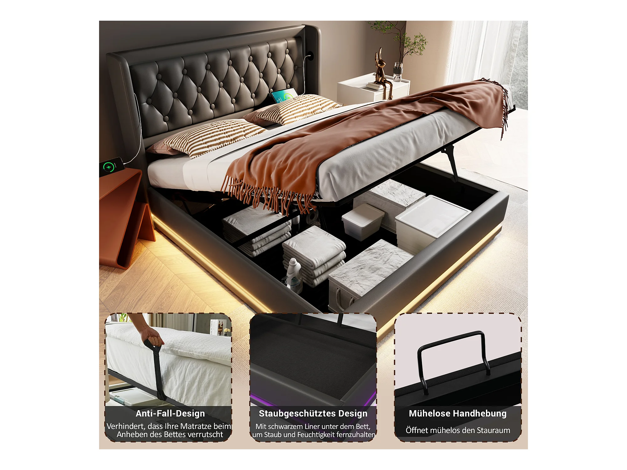 Letto imbottito in metallo 180 x 200 cm con testiera, 4 cassetti, luci LED e stazione di ricarica