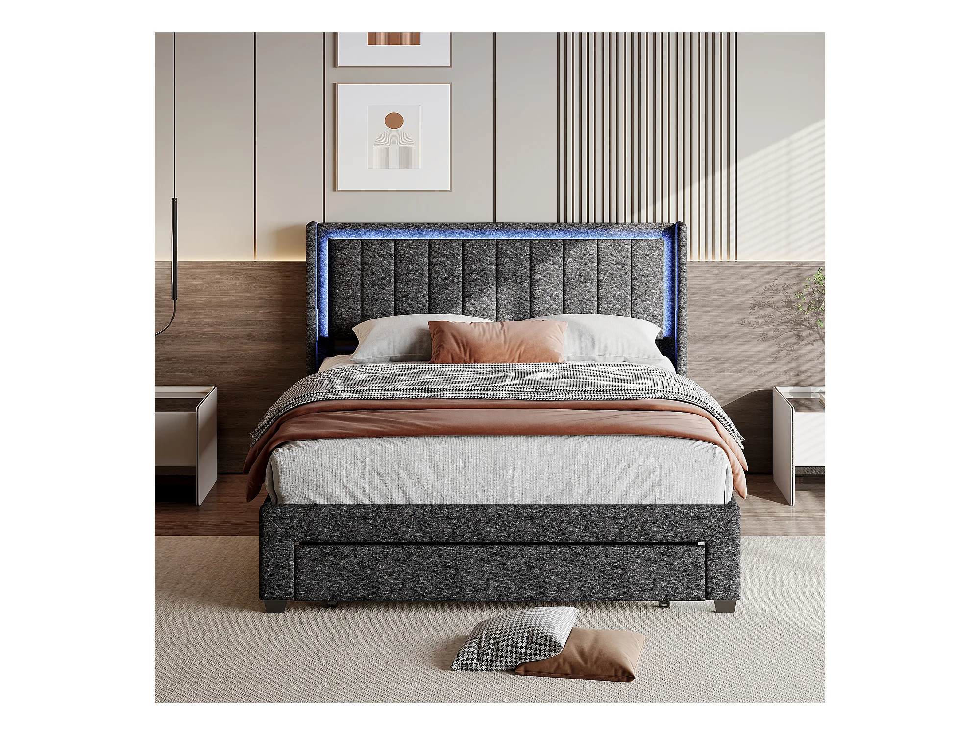 Letto matrimoniale 180 x 200 cm, letto imbottito con LED e 2 porte USB, spazio di archiviazione, grigio
