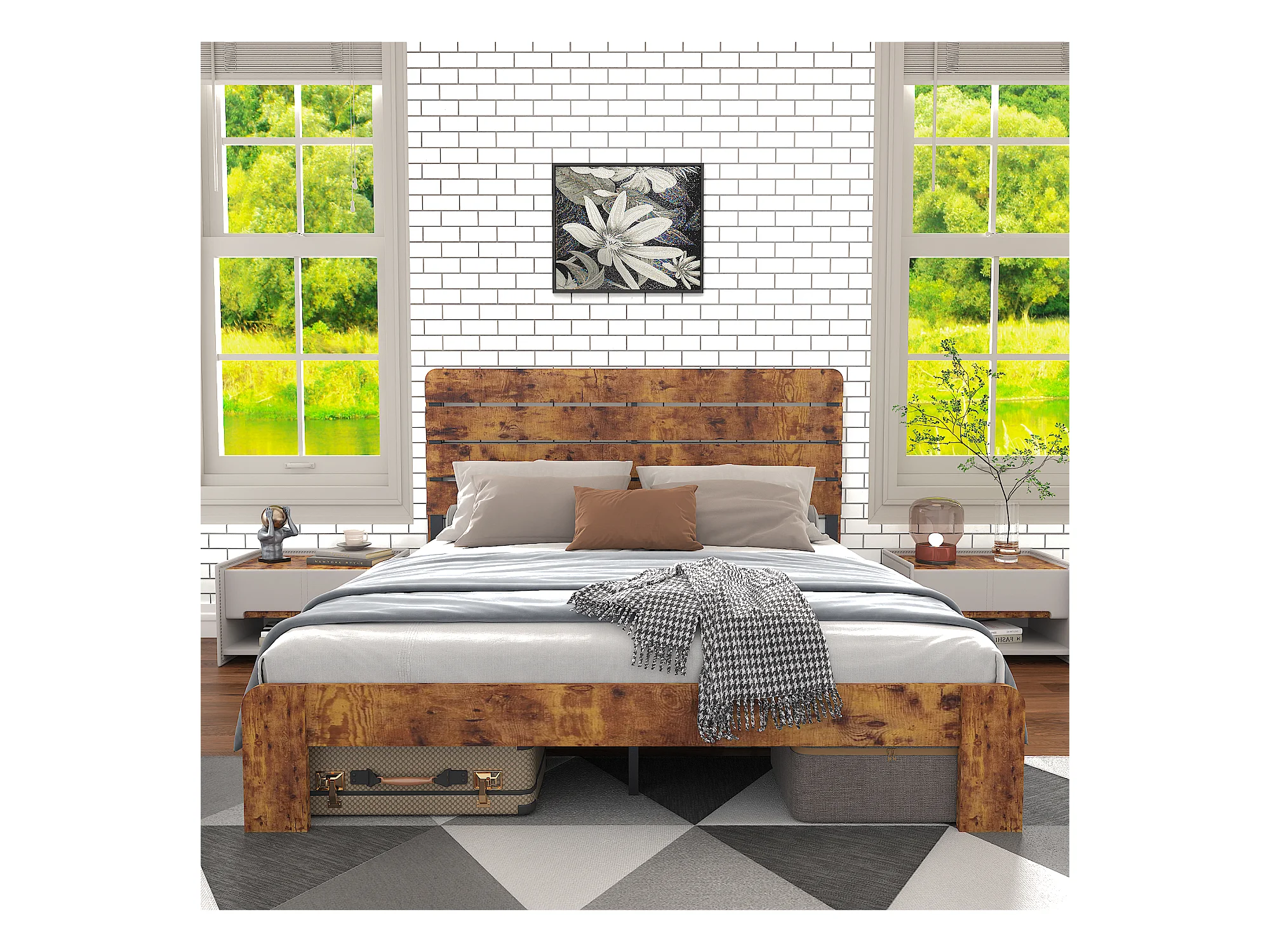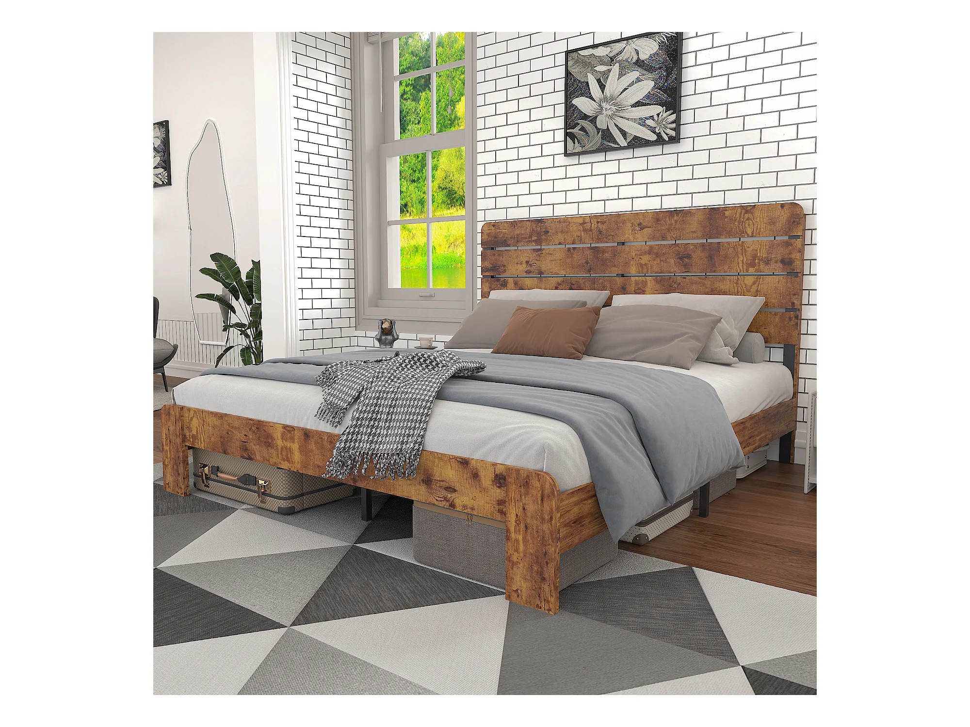 Letto matrimoniale 180x200cm con doghe in ferro e testiera alta, metallo + MDF, marrone