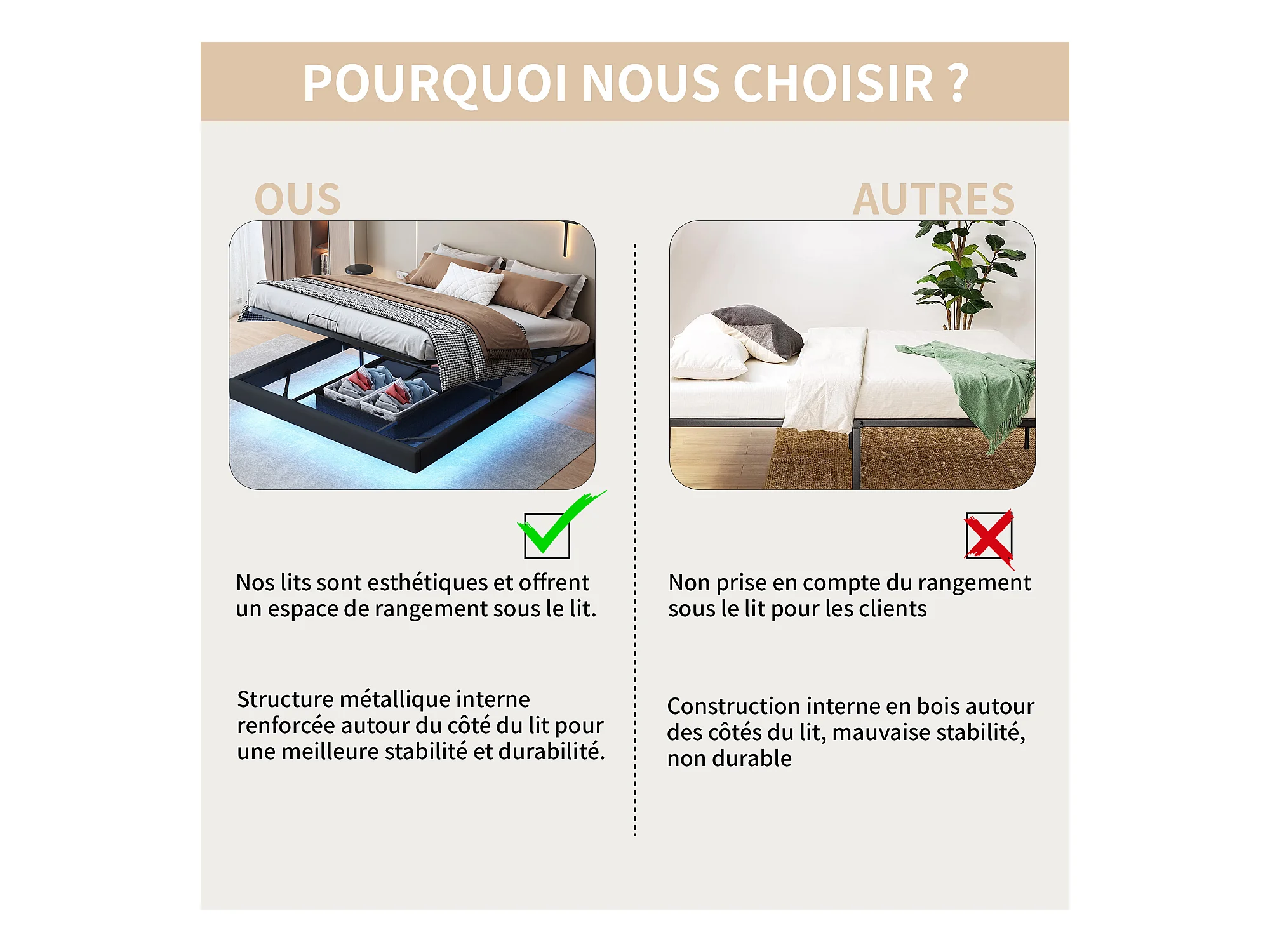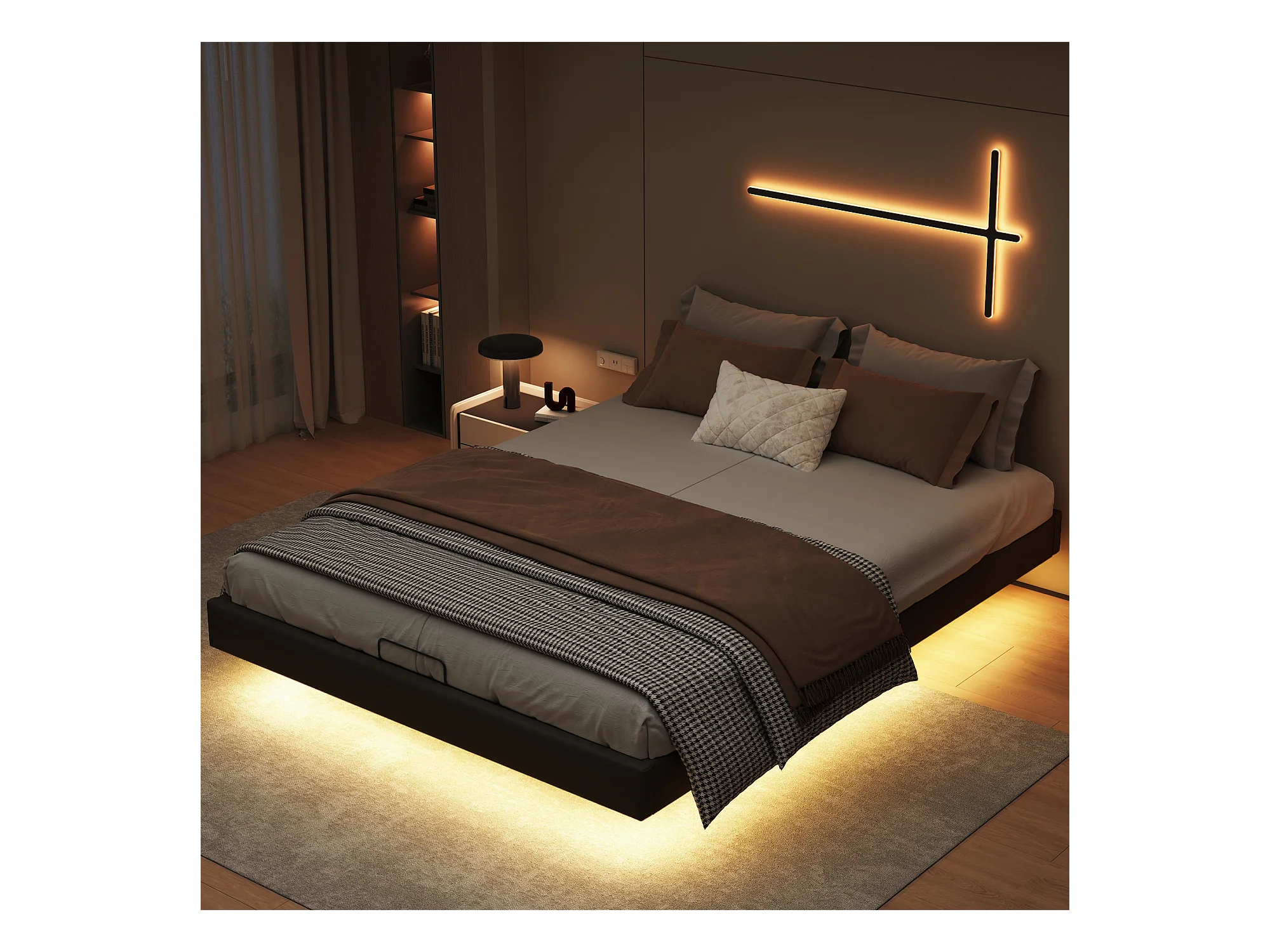 Letto matrimoniale beige 160x200 cm design flottante con LED, rete a doghe in legno, struttura in metallo e vano contenitore pratico