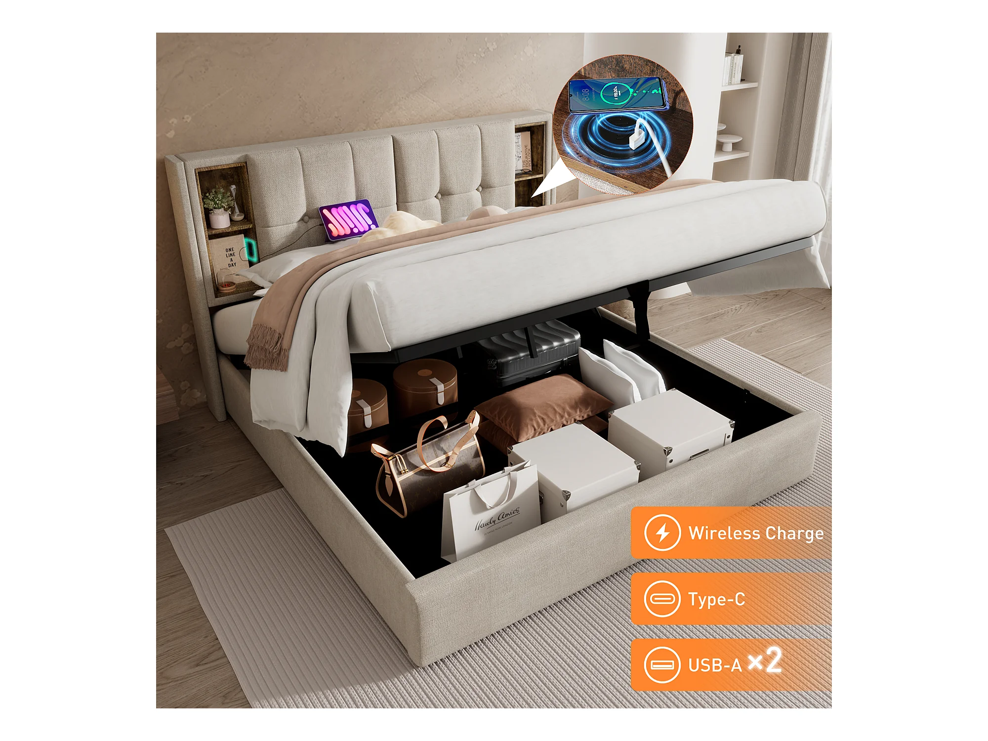 Letto matrimoniale con caricabatterie wireless USB-C, struttura rivestita in lino naturale, contenitore integrato, 160x200 cm (206x165x100,5 cm)