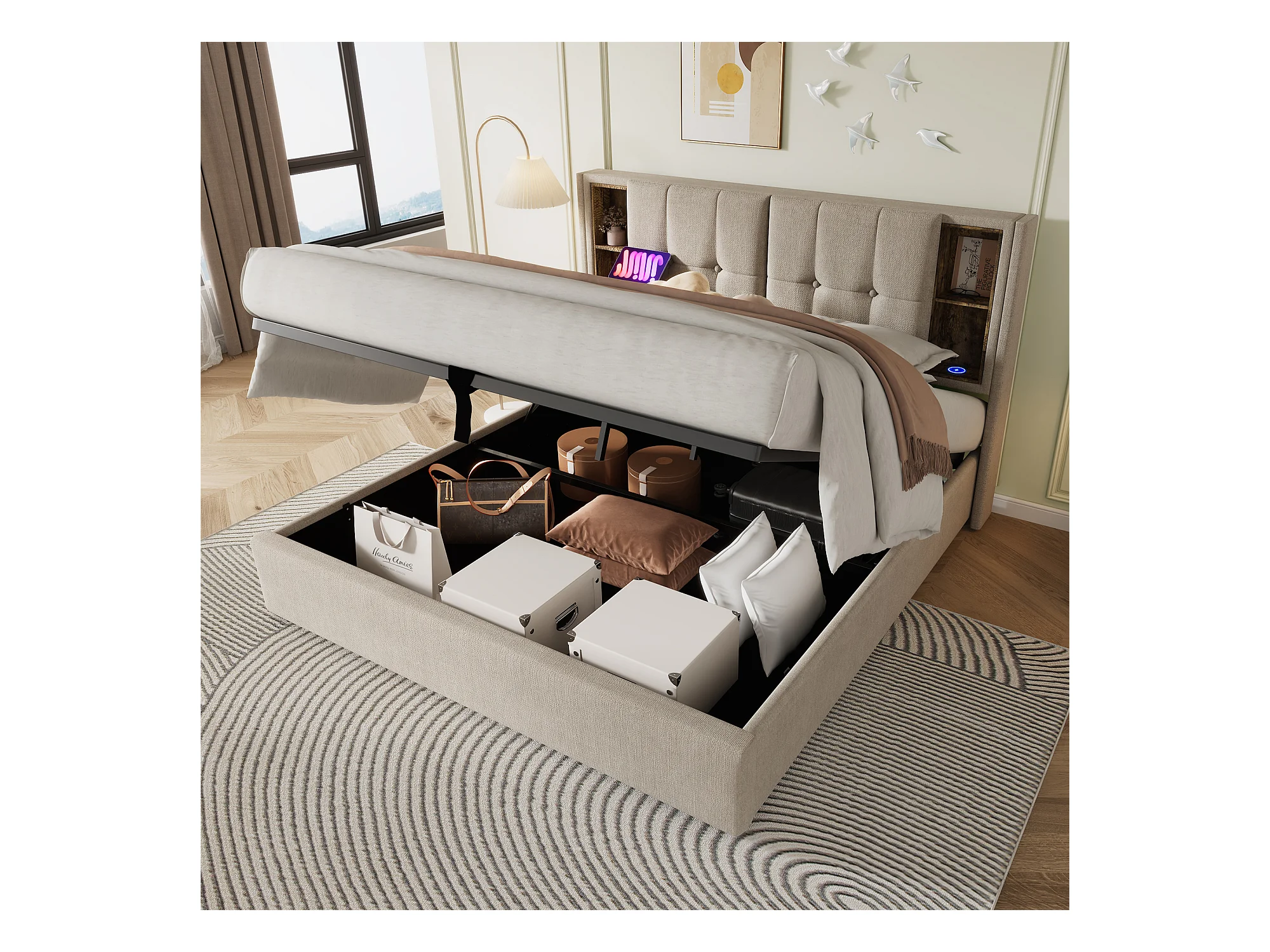 Letto matrimoniale con luce di lettura e funzione di ricarica USB, struttura con contenitore in lino naturale (165x206x103cm)