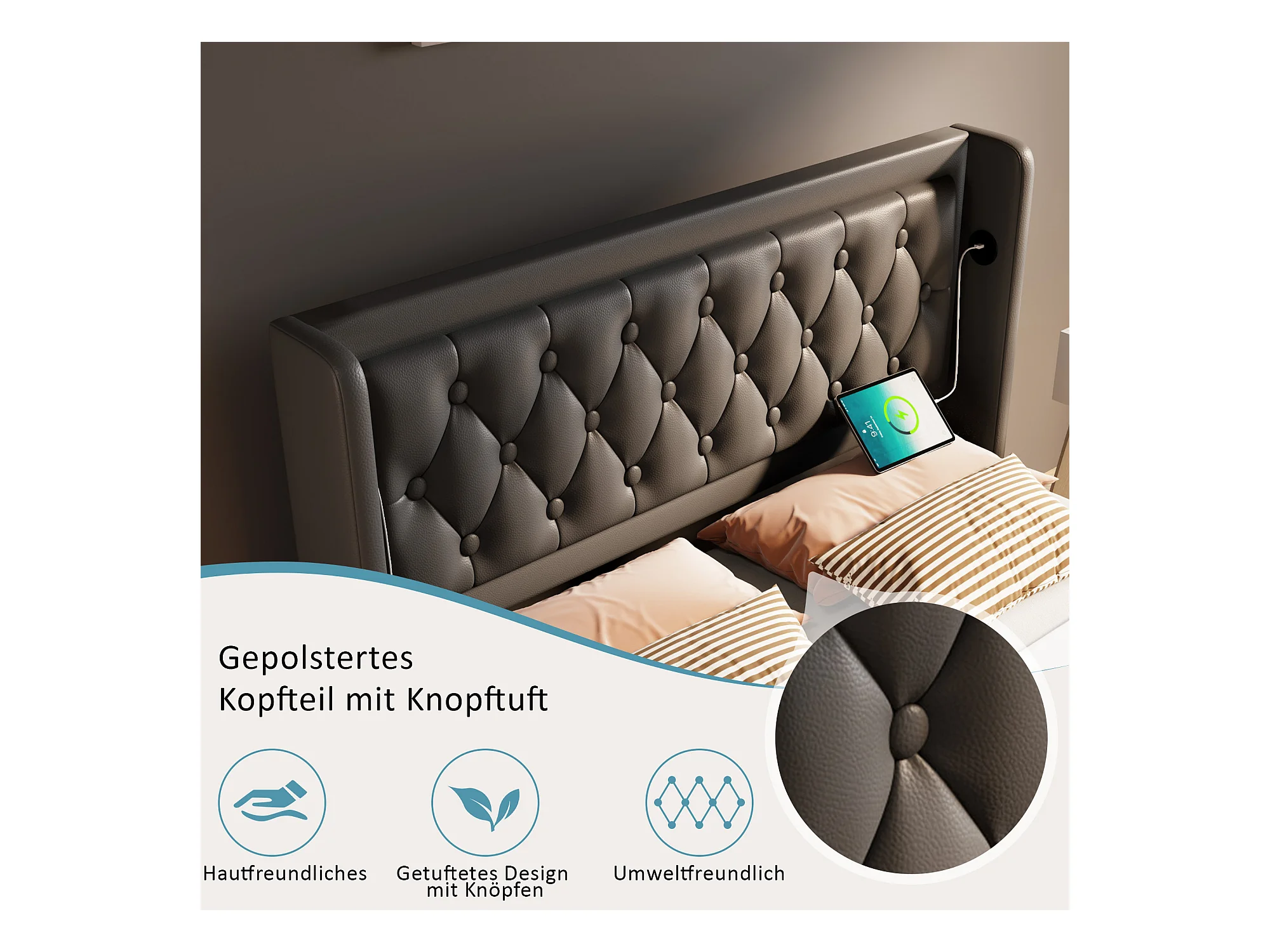 Letto matrimoniale con LED a 3 lati, sistema idraulico e contenitore, testiera con USB-C, PU nero, 160x200 cm