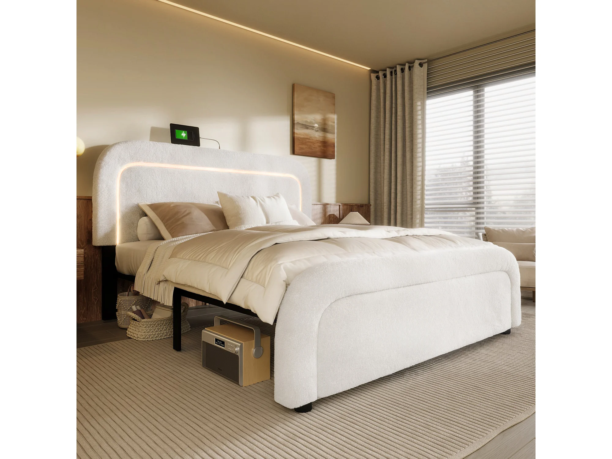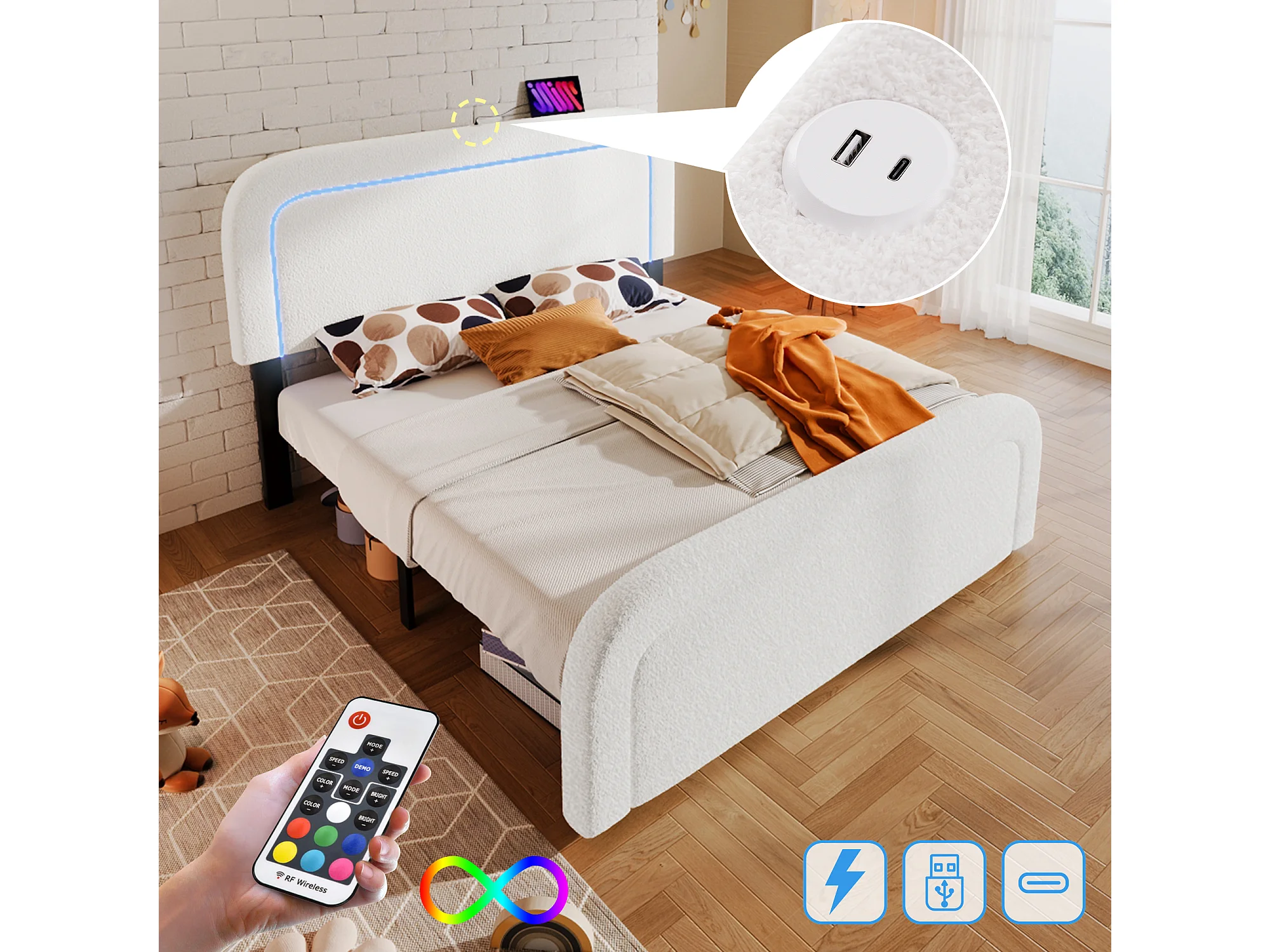 Letto matrimoniale con ricarica USB Type C e LED, testiera regolabile, 160x200 cm, sherpa bianco (dimensioni: 208x170x102,5 cm)