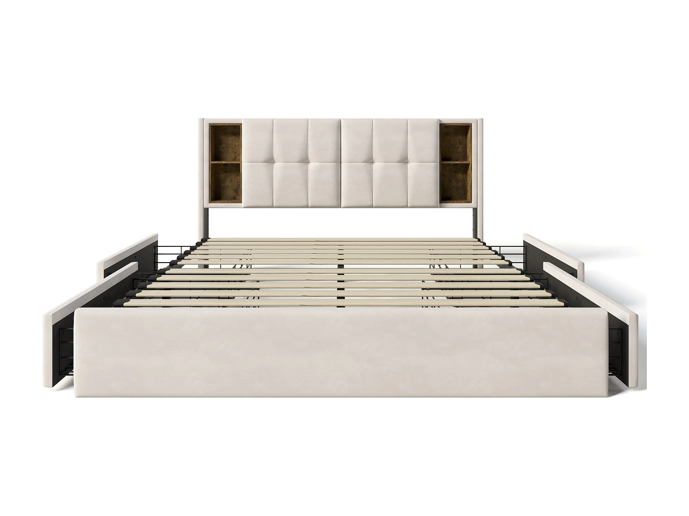 Letto matrimoniale con ricarica wireless USB C e 4 cassetti, letto imbottito 160x200 cm, struttura in metallo, velluto beige (senza materasso) (223x165x106 cm)