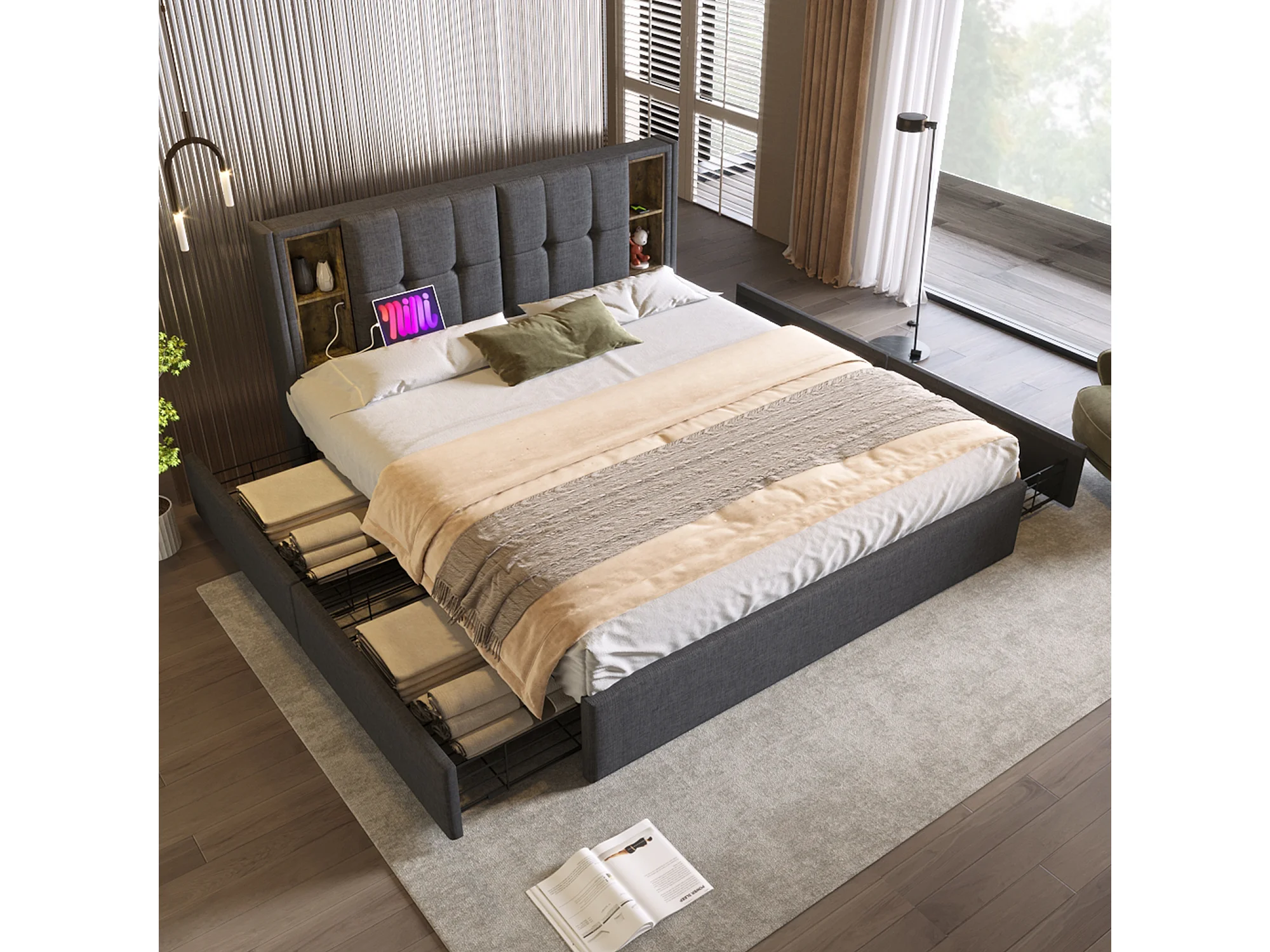 Letto matrimoniale 160x200 cm con LED, 4 cassetti, USB Type C e testiera regolabile, lino grigio (209x169x104 cm)