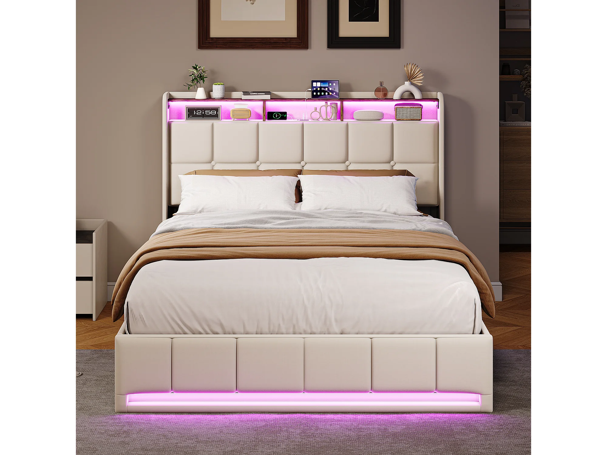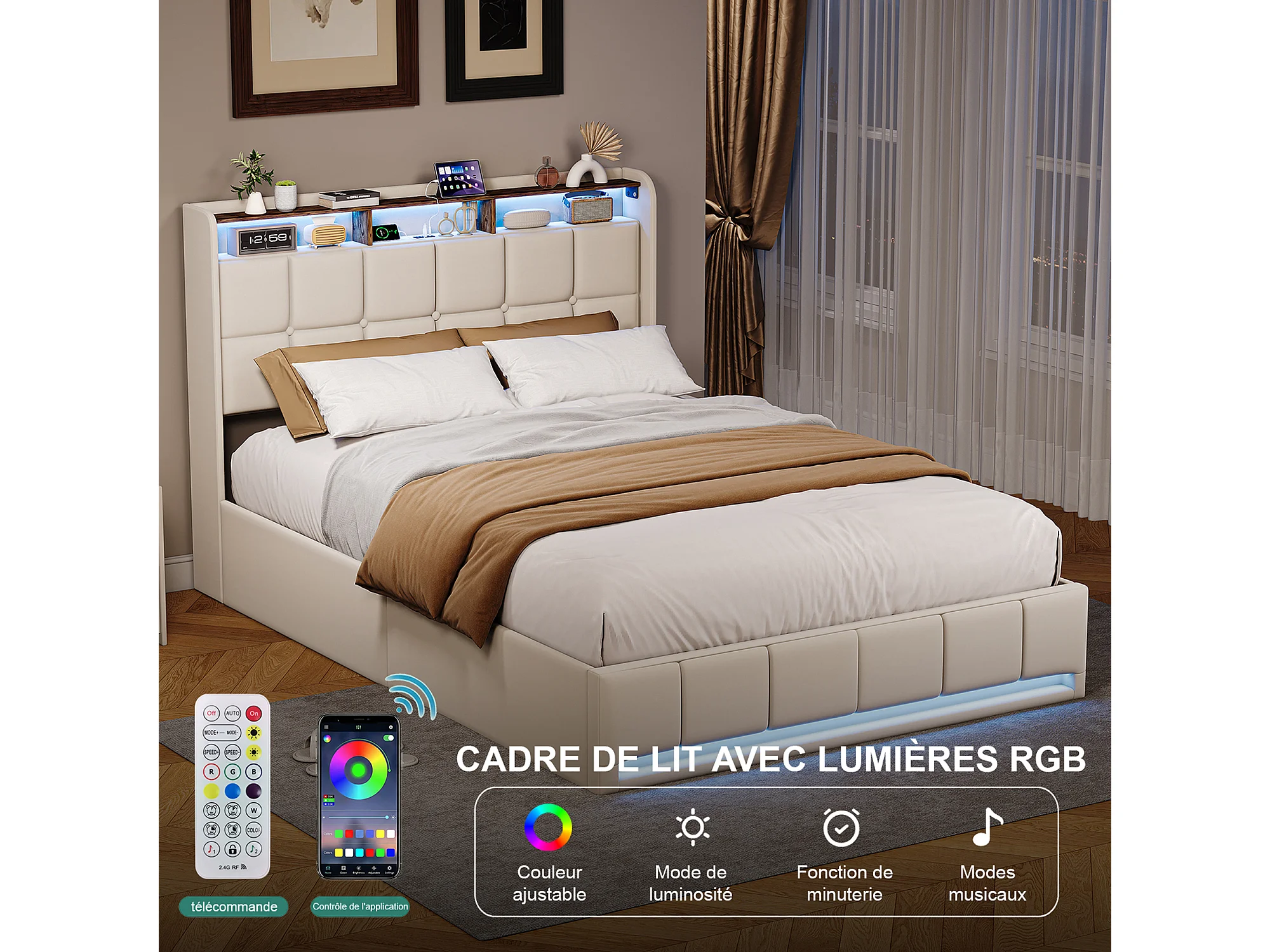 Letto matrimoniale contemporaneo 140x200 cm in lino beige con illuminazione LED RGB, USB integrata e 3 cassetti contenitori