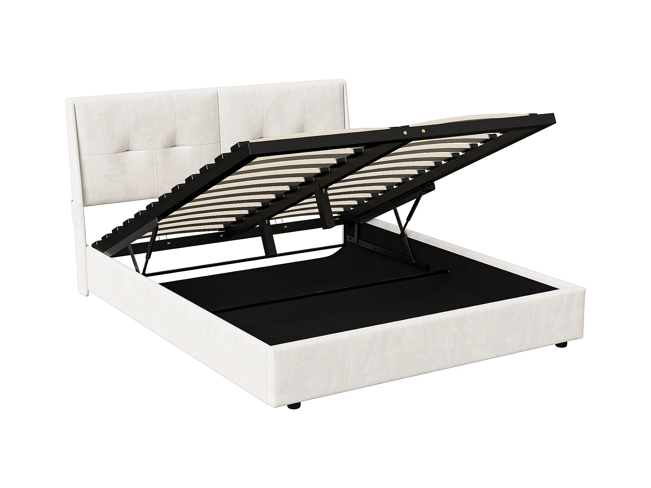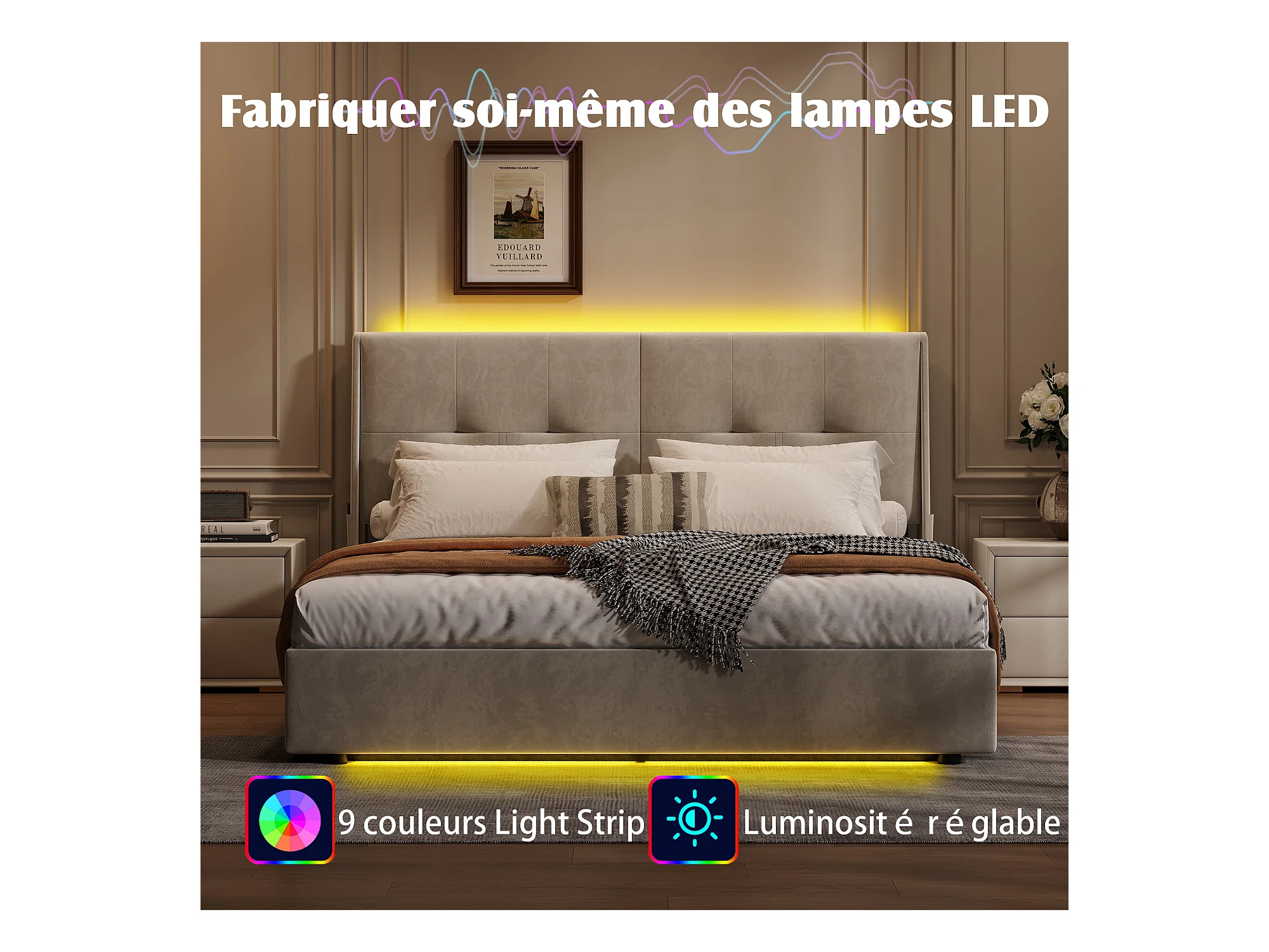 Letto matrimoniale contenitore con LED integrati e testiera in velluto con tasche laterali – 140x200 cm – Beige