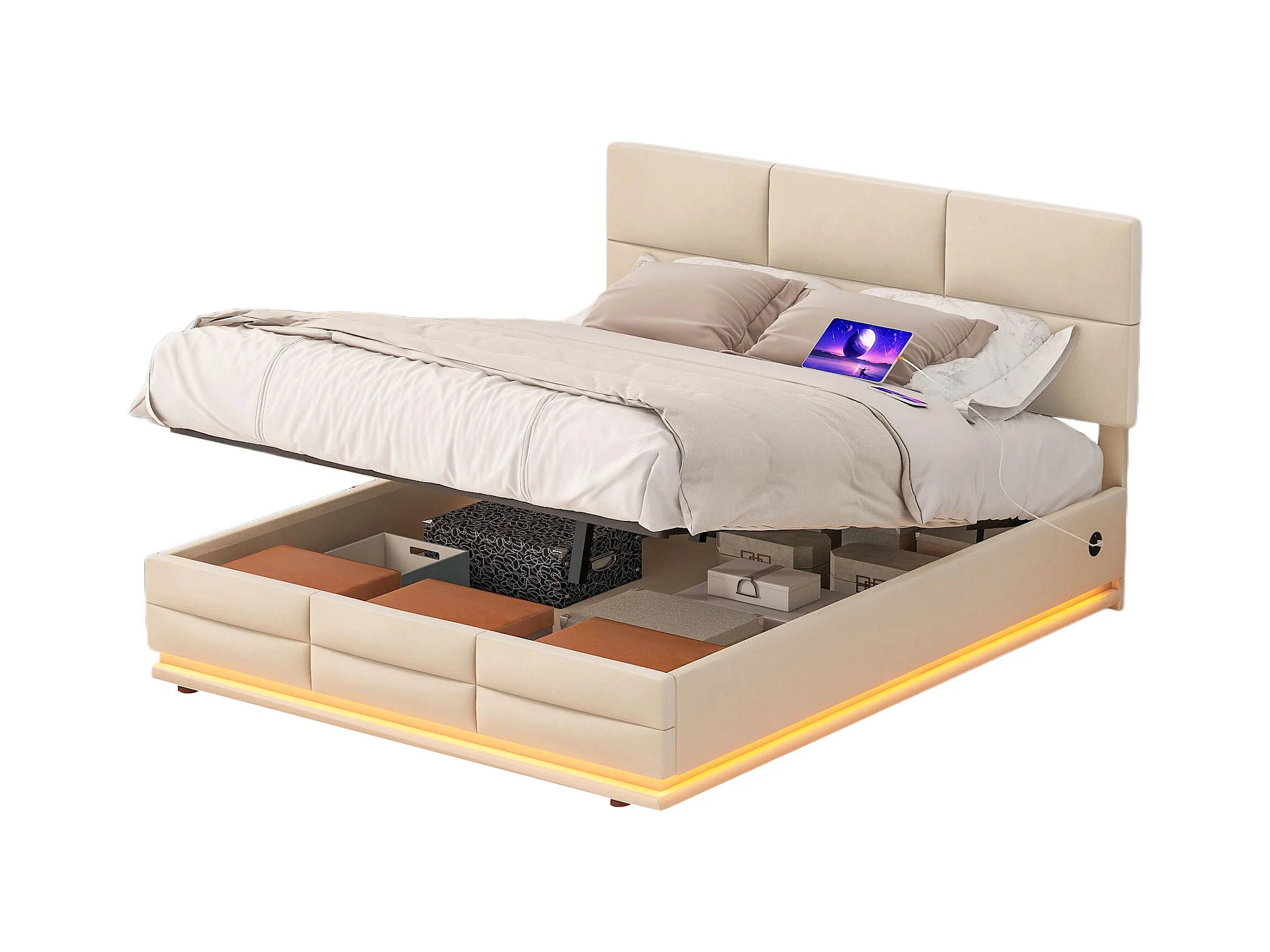 Letto matrimoniale contenitore imbottito idraulico 140 x 200 cm in velluto delicato sulla pelle con luci LED e caricabatterie USB, bianco