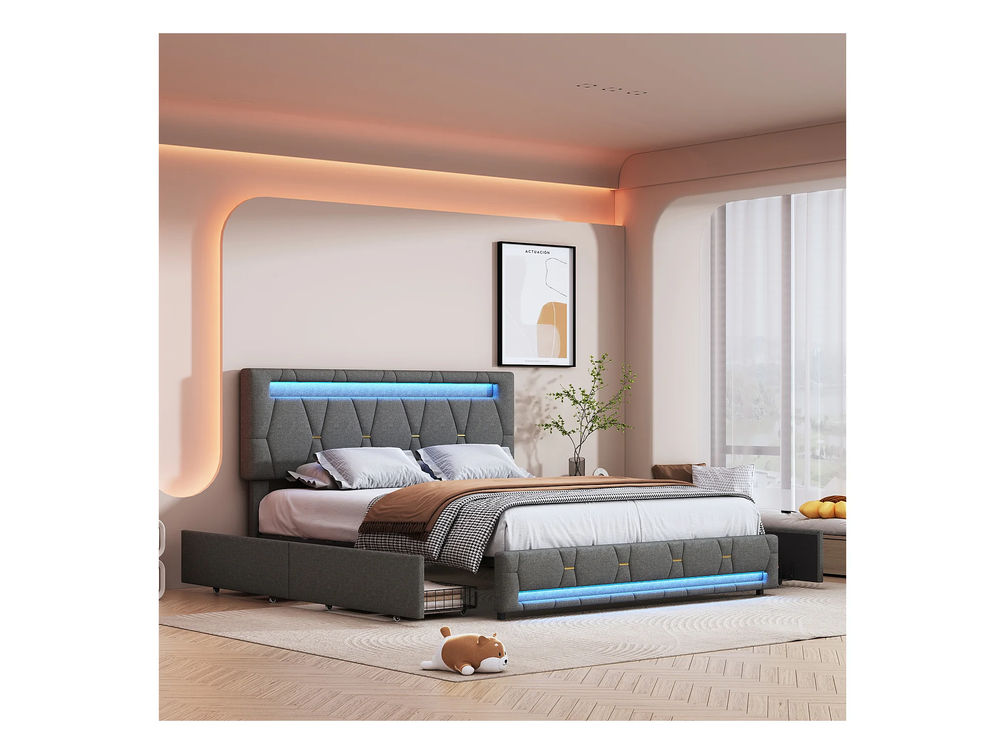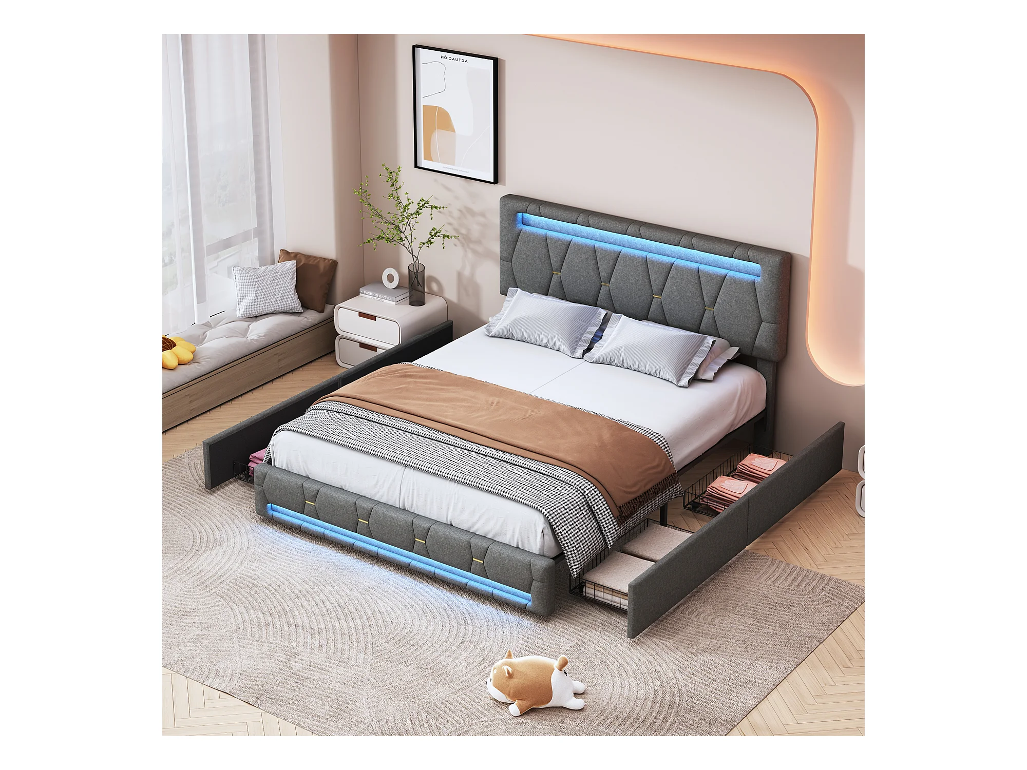 Letto LED 140 x 200 cm, con 4 cassetti, Letto matrimoniale, testiera regolabile, Letti contenitore, Lino, Grigio